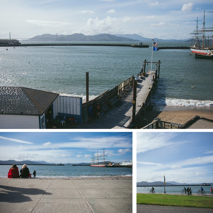 When it’s time to burn off the ice cream, here’s my favorite jogging route: up and over the hill on Leavenworth, past Lombard (where you’ll see tourists with cameras at all hours, which is oddly comforting), and down to Aquatic Park, along the water. Do some zigzagging up and down the concrete bleachers to mix it up a little, then head onto the Municipal Pier. It’s the perfect spot to stop for a rest and check out the boats, and to watch the Dolphin Club members swimming tirelessly in the Bay (most without wetsuits — my heroes.)