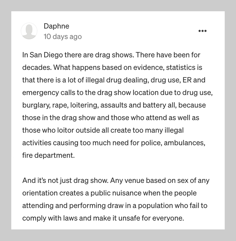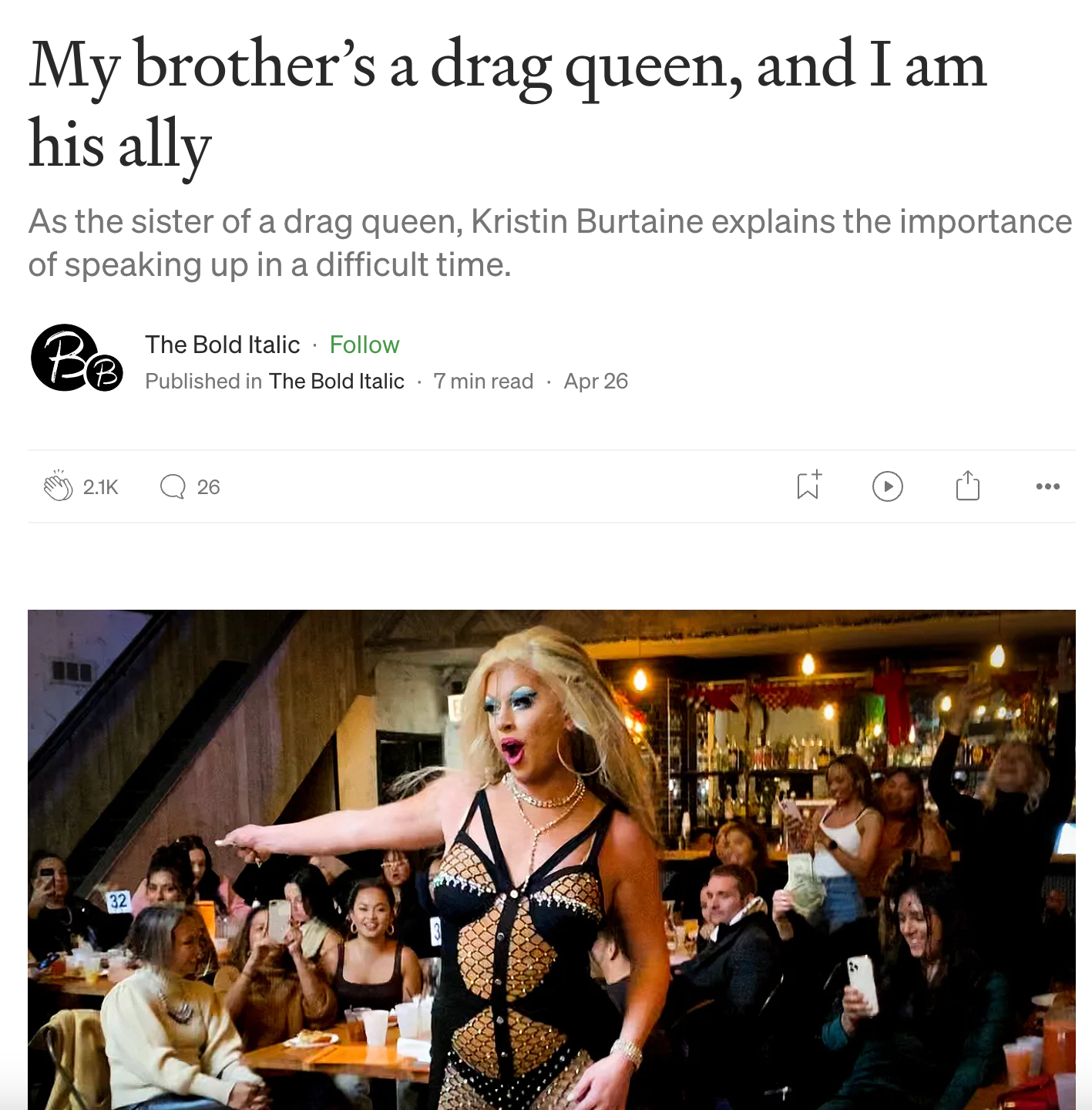 I’m not sure queer experience is so different nowadays. My family and friends all accept me, but I live in a self-selected bubble of queer people, artists, and occasional allies. A lot of straight people are tolerant of who I am, but they also live in their own cohorts without members of the LGBTQ community. Then of course there’s intolerance: At The Bold Italic, we published a story in support of drag shows, and someone replied with “based on evidence,” increased criminal behavior went down when these performances happened.