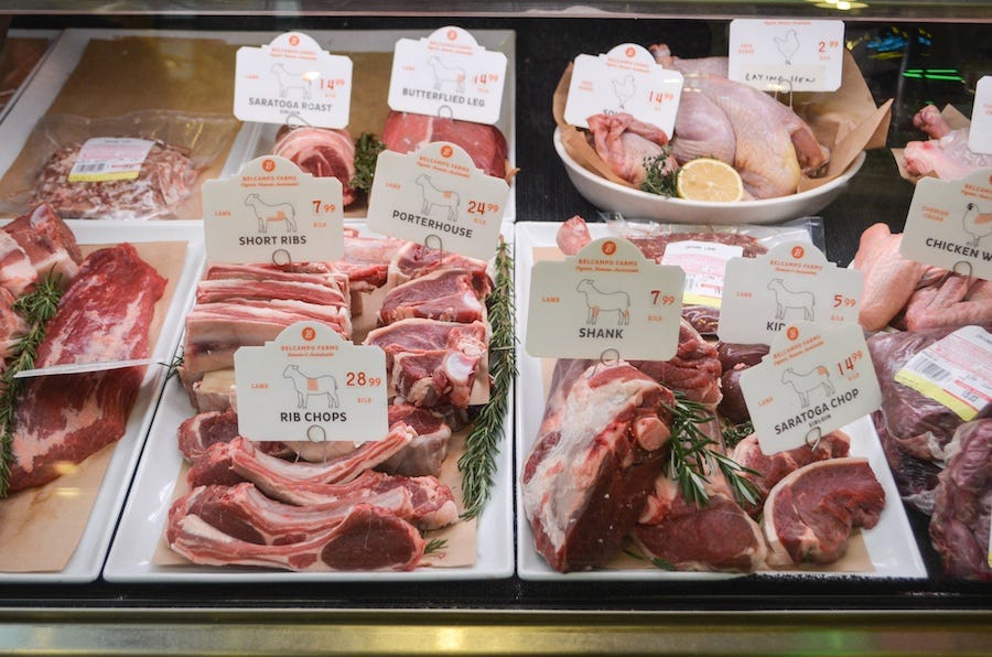 Belcampo is a full-service butchery with grass-fed meats. For the hungry patron who wants food right there, a menu of prepared roasts and stews is available. The Oakland-based company is at the top of the sustainability movement, and sees the butchery process from farm to table.