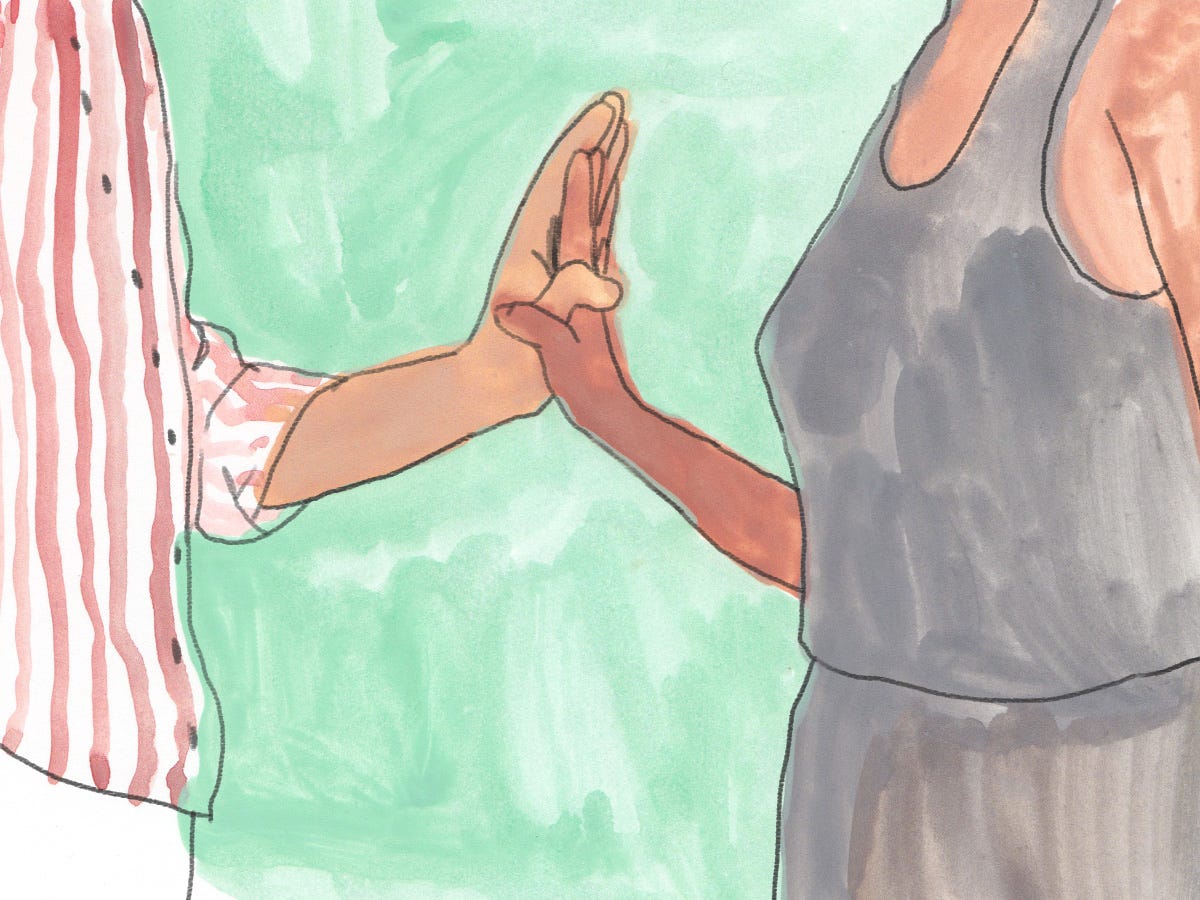 Those who have experienced the turmoil of manual-engine driving on the hills of San Francisco will appreciate the delicate yet learned tactic of this greeting. As your partner extends their fist to be pumped, grasp it as you would your stick shift and demonstrate the detailed intricacies of SF hill parking using their forearm as your prop. Take as many three-point turns as you need — nobody’s judging you.
