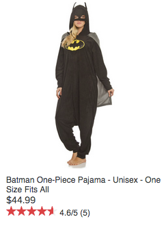 This is unisex bee tee dubs. So both men and women can be the Dark Knight of the bedroom. This also doubles as a costume for a “crazy MUNI rider.” You wouldn’t dare talk to the guy (or girl) in Batman PJs on the bus. Only drawback here? There’s no footies :-/ Next.