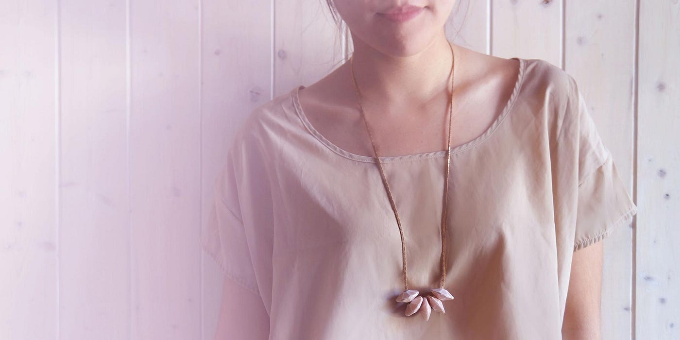 Halcyon is a bold, but elegant necklace by SF industrial designer Rachel Gant. Five peach-colored geometric lucite beads rest along a beautiful vintage brass chain.