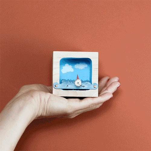 Hand made wooden boxes house a sail boat and with a turn of the crank the boat sails on the waves! Available in all natural and with a blue sky background.
