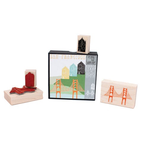Stamp the Golden Gate Bridge or a cityscape of Painted Ladies on your Christmas card envelopes. Comes with two rubber stamps and ink pads. Buy the set online or at Whole Foods Market.