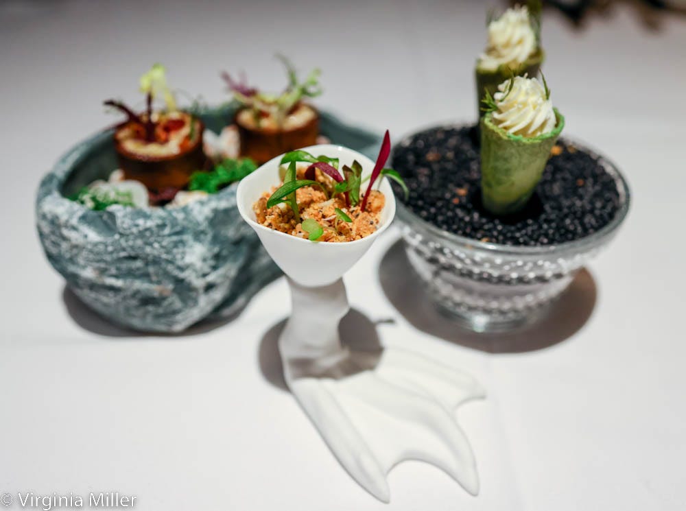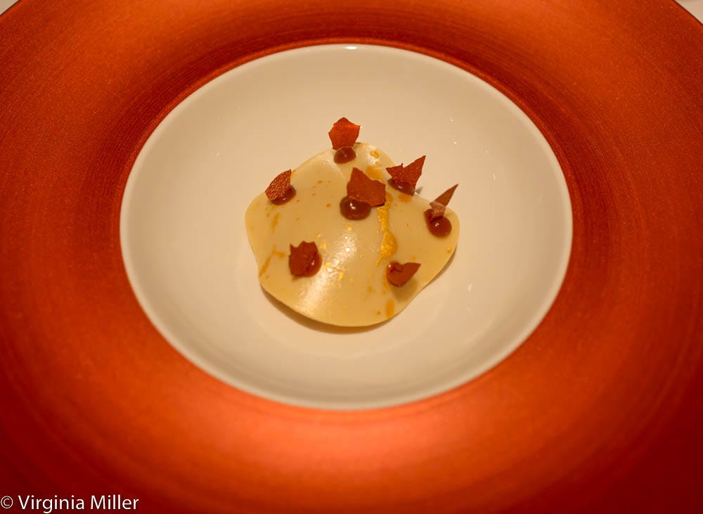 Ancient Rome is showcased in a dish considered indigenous food in Roma: puls, a farro-grain pottage (French for ‘food cooked in a pot’). Efthymiou’s smart farro puls arrives on a striking rust orange plate in pecorino cream and onion skin under a “bacon veil,” dotted with caramelized onion gel, pancetta crumble and brown butter. The bacon and pancetta dominate on the palate, overpowering the onion elements I wish were allowed to shine. But it’s an artful dish that gives me a peek into Efthymiou’s style. It came with my favorite wine pairing of the night with a natural, orange Greek wine: 2020 Domaine Glinavos “Paleokerisio,” made from obscure grapes (97% Debina; 3% Vlahiko). It’s rosy, funky, nutty and spiced, brightening up the dominant saltiness of the puls.