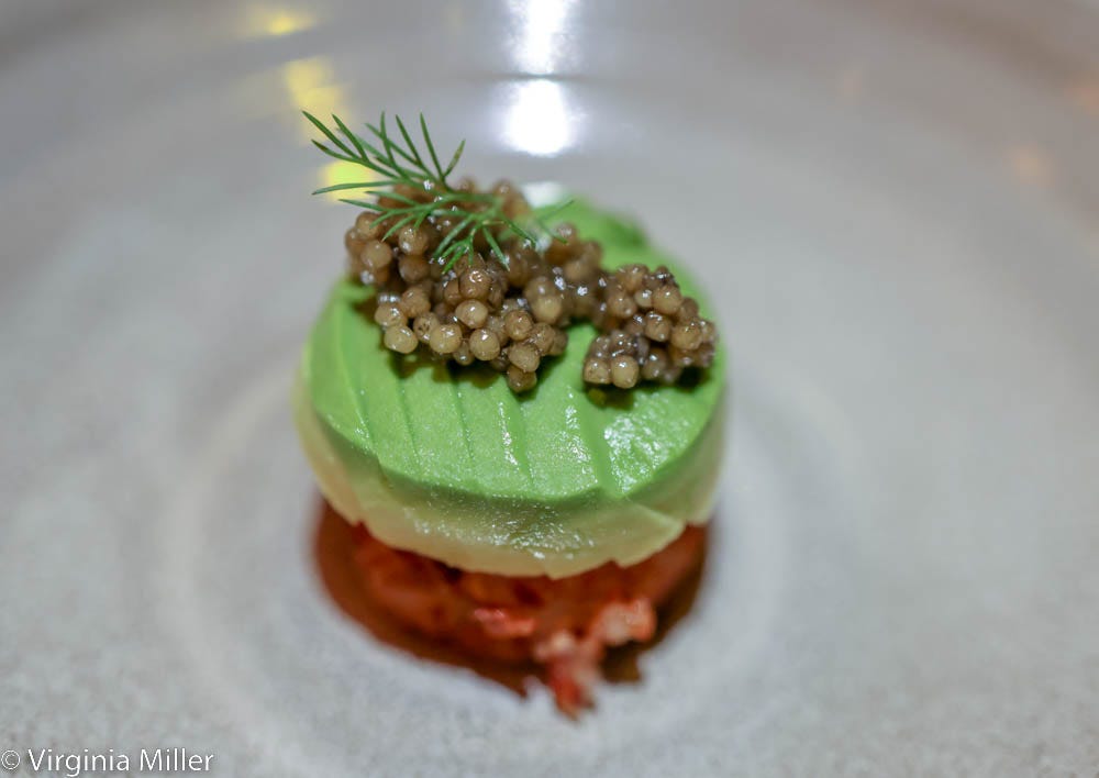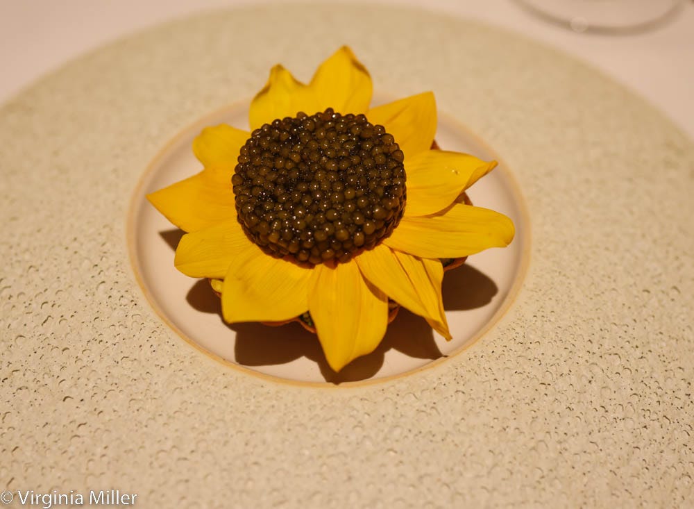 A supplementary ($75) caviar sunflower starts to feel heavily rich with confit egg yolk at its center, more generously portioned than expected. Perfect to share, it’s a beauty of a “sunflower” with a sunchoke tartlette base dense with the aforementioned egg yolk and smoked sturgeon mousse, centered with Tsar Nicoulai golden osetra caviar, surrounded by brilliant yellow sunflower petals. Whispers of pistachio and dill make it sing, nicely complemented with the tropical, elderflower notes of an unfiltered NV Zero Infinito Solaris pet nat from Italy’s Alto Adige.