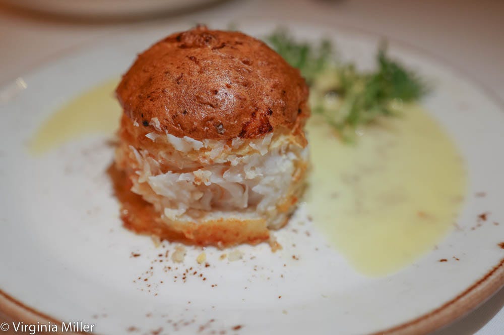 A starting amuse bouche of One Market’s popular latkes, a mini-version, layered in avocado mousse and caviar, made me smile. Chef Adrian Hoffman’s (2000–2004; currently Billingsgate and Four Star Seafood) era was when I first visited One Market, not long after I moved to SF in 2001 as a young thing intent on getting to as many restaurants as possible each week. Hoffman’s local petrale sole soufflé is a cute little “cake” lush in caper butter, cut by sprigs of mâche (lamb’s lettuce). I don’t remember having it back then but wish I did. I live for seafood and seafood soufflé… especially as this manageable size. Chef Dommen’s Dungeness crab cakes remain a standard here, not just because of a welcome touch of saffron aioli, but because they are crab-heavy, showcasing our local Dungeness bounty.