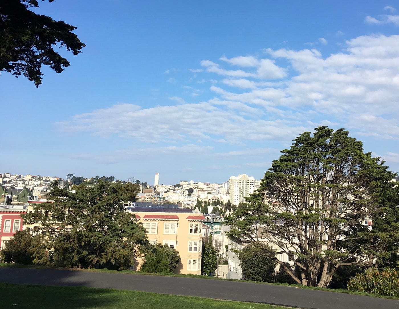 The walk takes me up and down steep hills, with views of Sutro Tower on my left and the rest of the city on my right. I marvel at the city’s layered landscape and suppress sharp pangs of real estate envy as I quietly progress, encountering only the occasional mailman or your run-of-the-mill fit lady walking her dog. On a street corner, two young couples are having a lively discussion about buying real estate in Santa Barbara. Gorgeous, elaborate homes reveal snippets of their treasures: a sculpture, a fuzzy armchair, a gallery wall. The air is crisp, heavy with wealth and prosperity beyond my understanding.