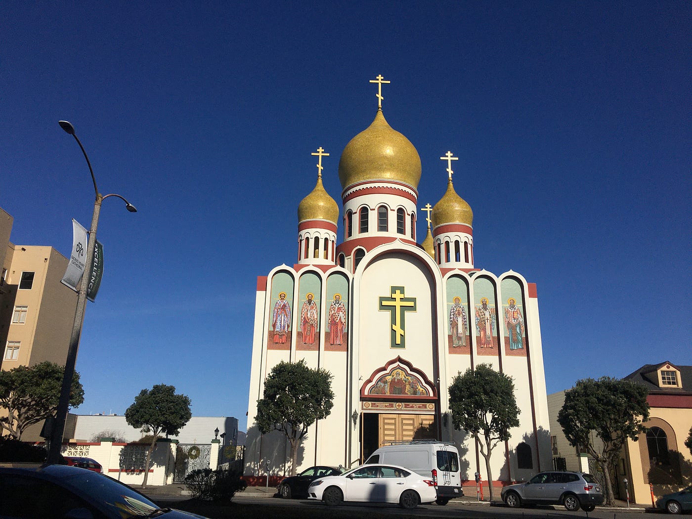 Around 37th Street, I get a glimpse of the upscale Sea Cliff neighborhood—not physically gated but clearly marked by two massive brick posts. Yet Geary’s grandeur is a catalog of the city’s faiths: the beautiful Russian Orthodox Holy Virgin Cathedral, a Tuscan-looking mortuary, a Catholic church.