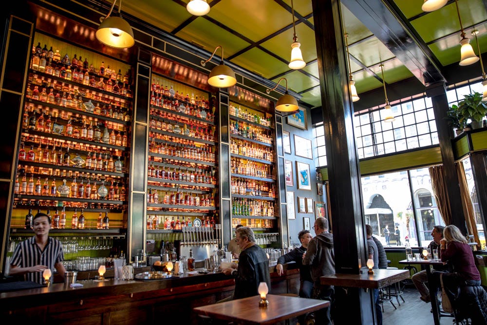 Officially open March 23, Bottle Club Pub (BCP) is the latest from the pioneering Future Bars (FB) behind Bourbon & Branch, Rickhouse, Pagan Idol, etc. FB — with designer Andrea Gifford — completely gutted, designed, and brought to life a historic, lofty, brick-walled space that was covered over and buried as a diner for decades. Its curved corner alley building with massive windows and skylights imparts natural light, striking and sleek with old-world elegance, relaxed vibe, dramatic rotating bottle shelves, and vintage ceramic whiskey decanters lining the walls.