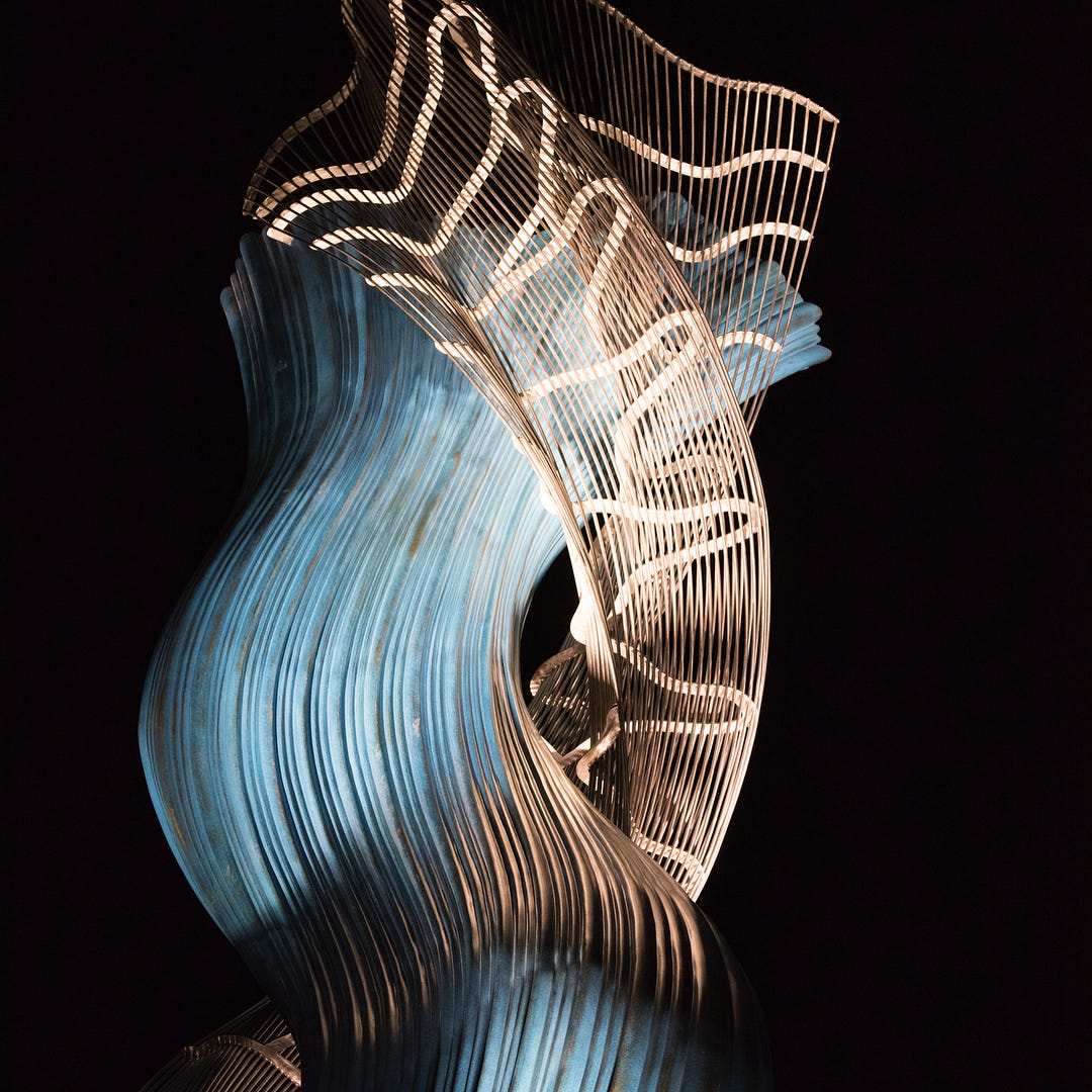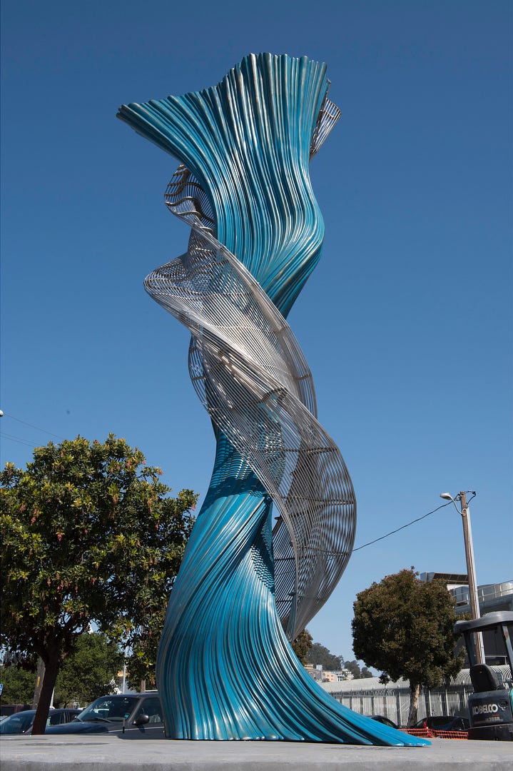 Located at Bayview Gateway — nestled in the recently renovated space along Islais Creek Park — this statue by Cliff Garten is a 20-foot-tall, stainless steel construction that’s meant to mirror the ebbs and flows of Islais Creek itself. (It mirrors the original bends of the wide creek… before concrete and buildings diverted its direction.) When our solar system’s star goes down, the stringed LEDs, which are woven along with the steel, illuminate the metal statue, making it appear to undulate like a running stream. During the day, the blue-hued steel nods to the color palette of the creek it’s named after.