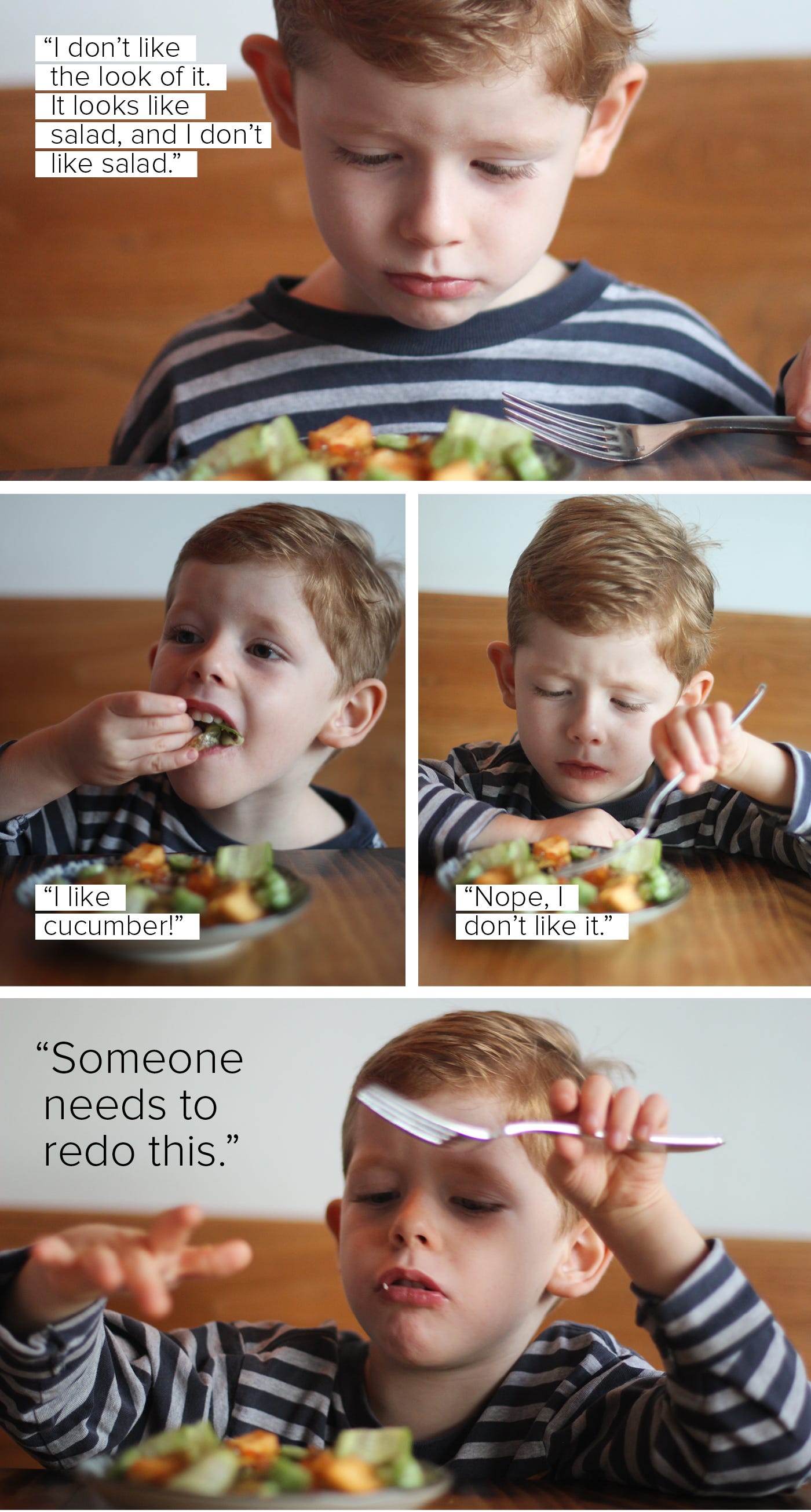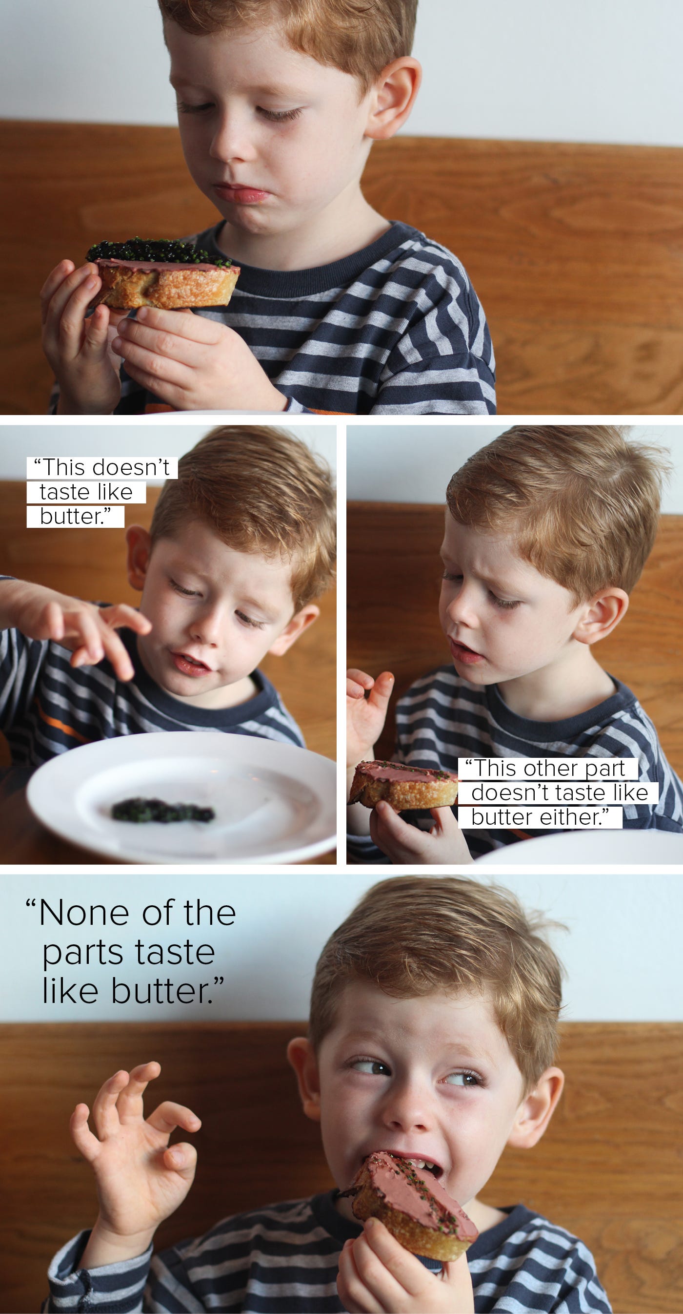 “NOT THAT AGAIN!” he shouted as the next dish arrived. That “very top” part of the toast left him with some serious green-stuff-in-a-long-shape PTSD. Everything was totally fine once he realized there were two slices of toast behind the bone.