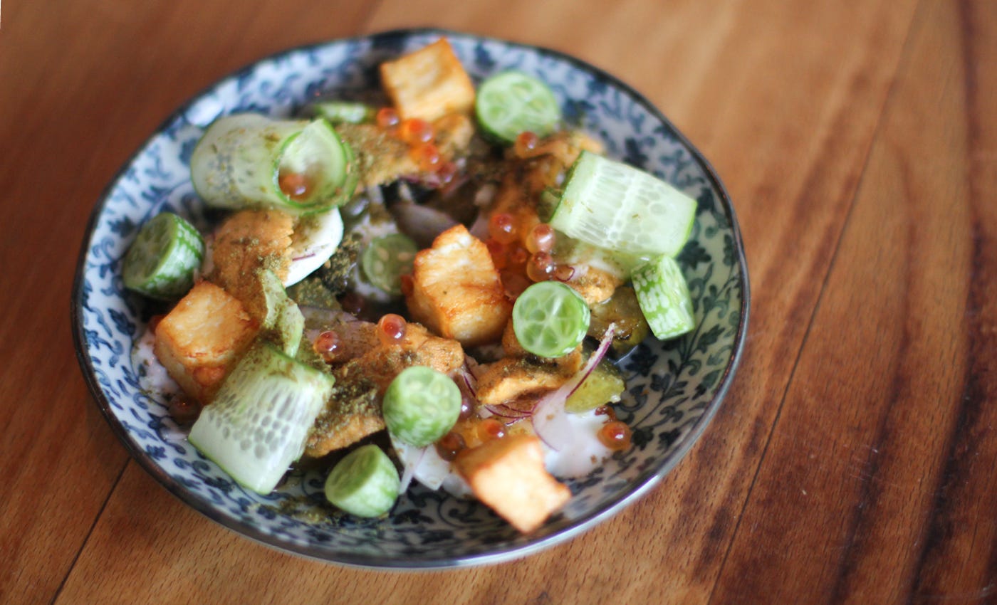 Japanese uni, heirloom cucumbers, za’atar, fried cheese, hard boiled egg