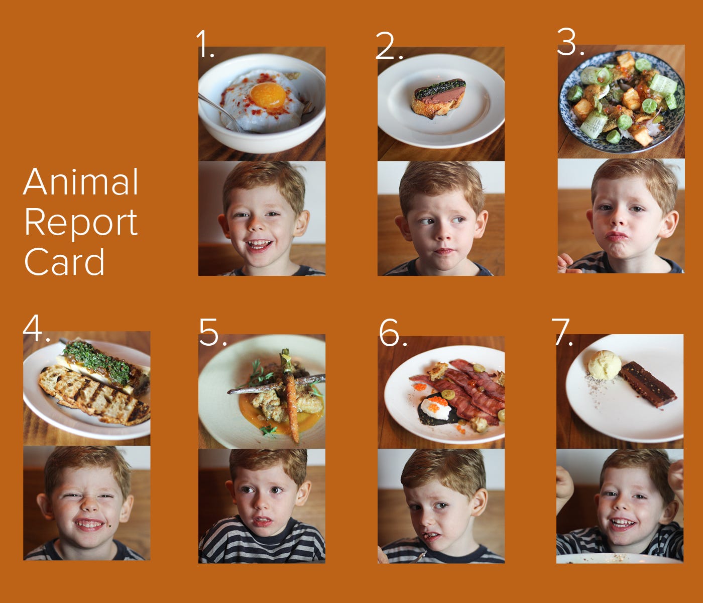 For our sixth installment of little kids reviewing restaurants, Isla and I took four-year-old Evan Huelsbeck (favorite food: “a lot of stuff”; least favorite food: “salad”) to Animal in Los Angeles. Animal is a meat-centric restaurant (obviously) and an ideal spot for a miniature food critic who hates salad.
