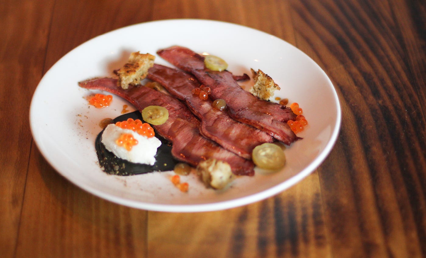 Veal tongue, gherkin pickle, salmon roe, black mustard
