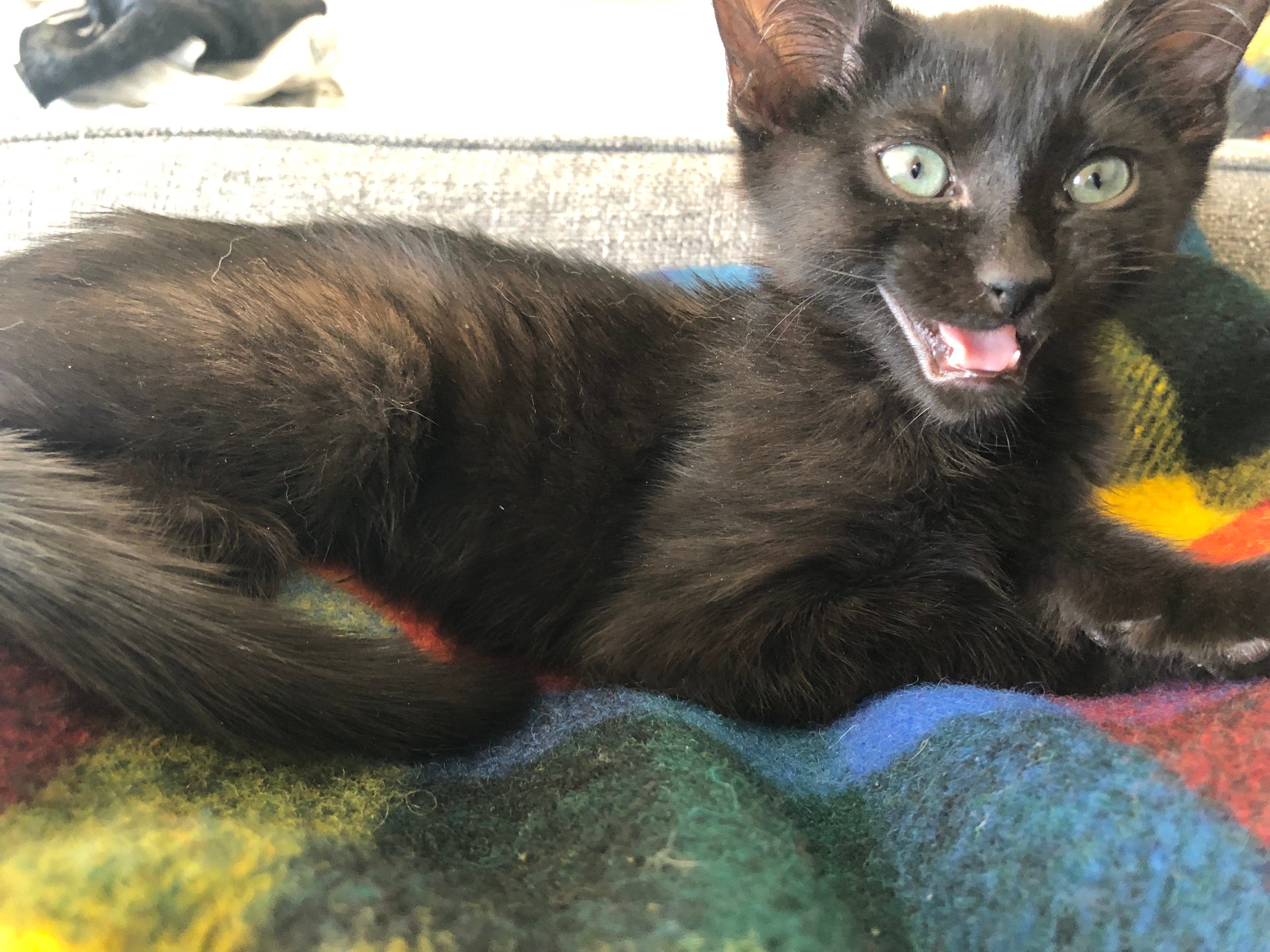 Then we went to a room full of three-month-old black kitties. A couple of my friends have cool black cats, and I had actually grown to like their social natures and Halloween auras. So I sat on the floor, and some kittens started to climb on me. One initially got my attention by walking on my arm, but another silently made his way into my lap and settled there. “That’s the one,” declared my boyfriend of this scraggly kitty with blue eyes and oversized ears. On the elevator ride down, with the tiny kitten in tow, we both decided to call him Frank Sinatra. “Frankie” would suit his young personality well.