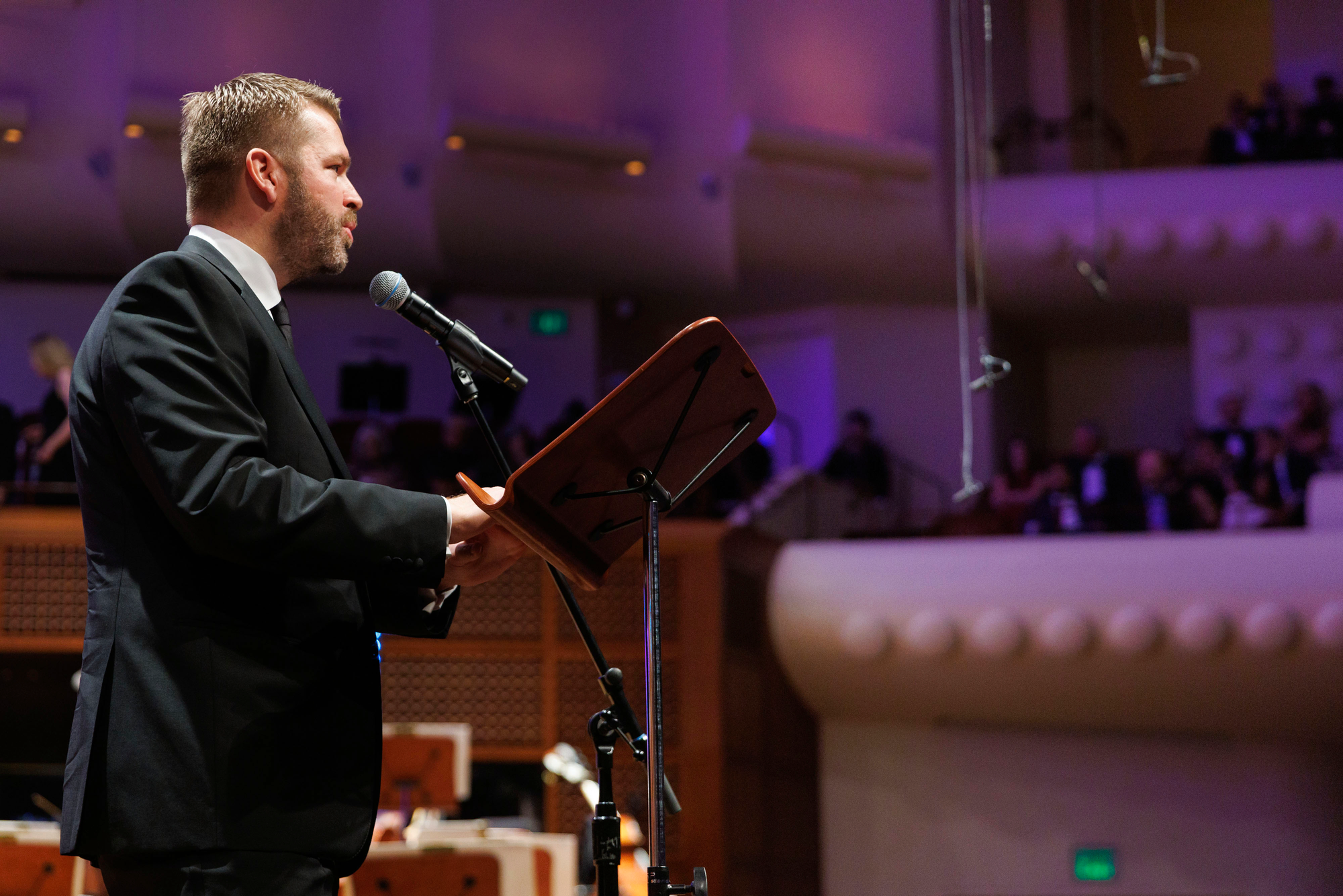 When the musicians walked out from both wings of the hall, the audience gave them a long, boisterous, cheering ovation. It had the energy of a home team returning to the field. CEO Matthew Spivey addressed the crowd before the music began. A friend of mine was in understated black, almost plain, and told me it was in solidarity with the performers. Which was definitely a fashion statement for someone like him.