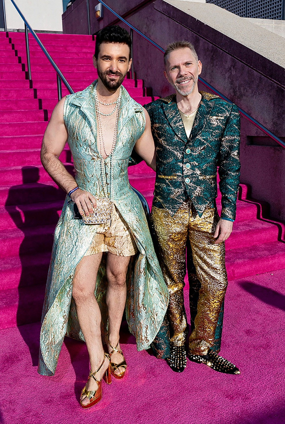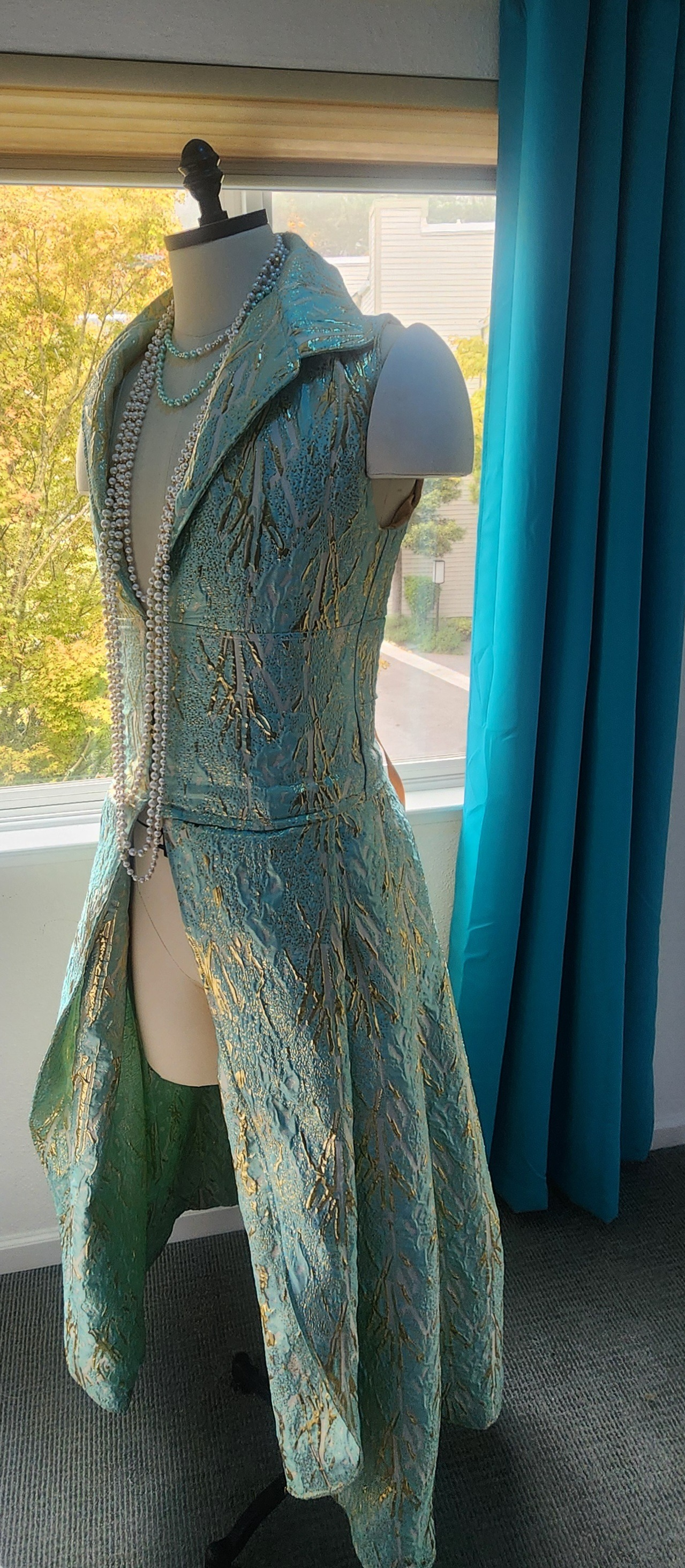 This felt more glamorous than any symphony night I can remember. Davies was dressed. I don't know if the near-miss of the strike made people want to show up harder, or if the programming drew a different crowd. My boyfriend and I came in custom looks for the evening — I made a brocade coat-dress and shorts in seafoam and gold; he wore a green-and-gold brocade suit to match. We're regulars at the Symphony's Lord of the Rings film series, so we wanted looks for a future moment that really leaned into like a tree-dwelling Rivendell-at-cocktail-hour energy.