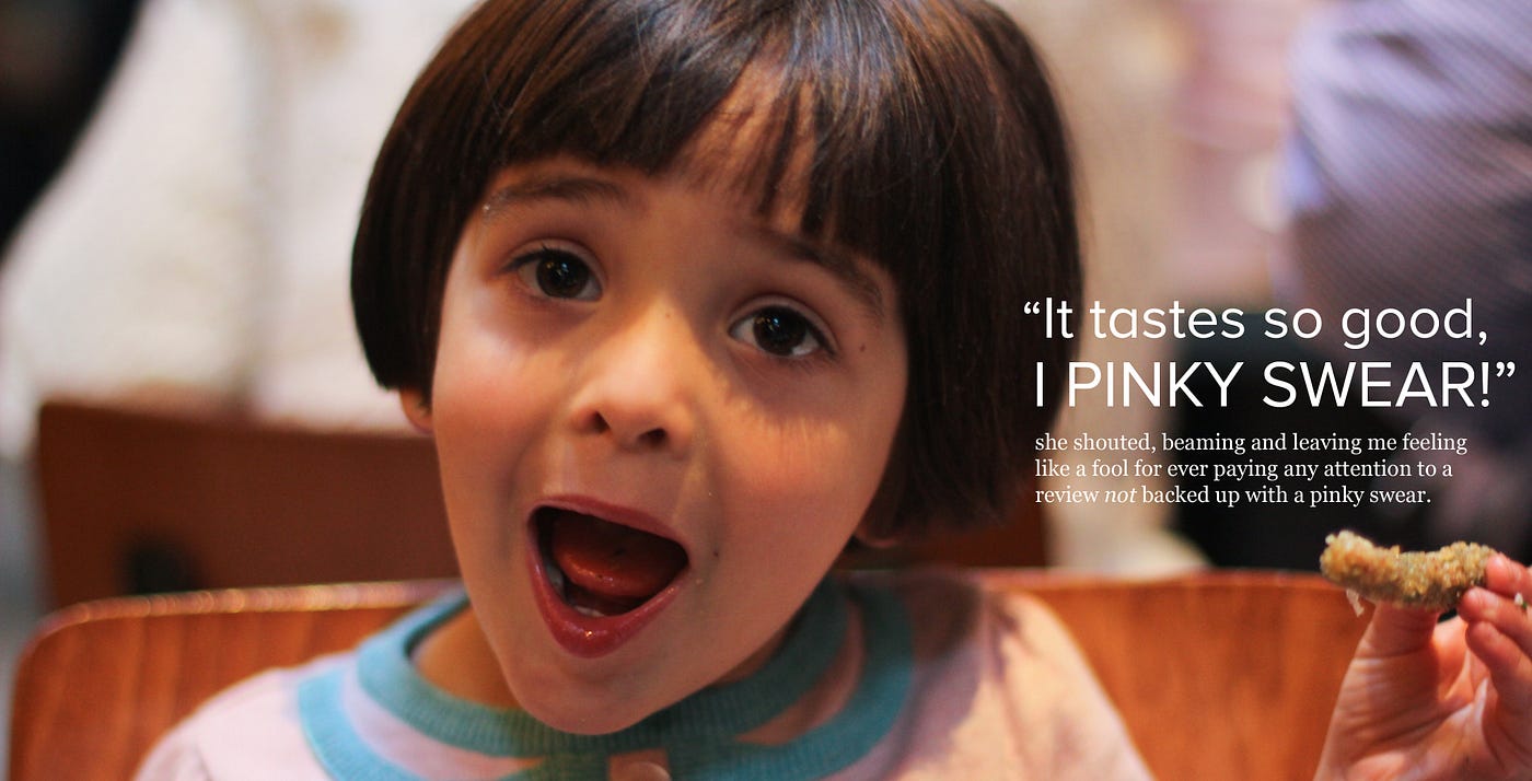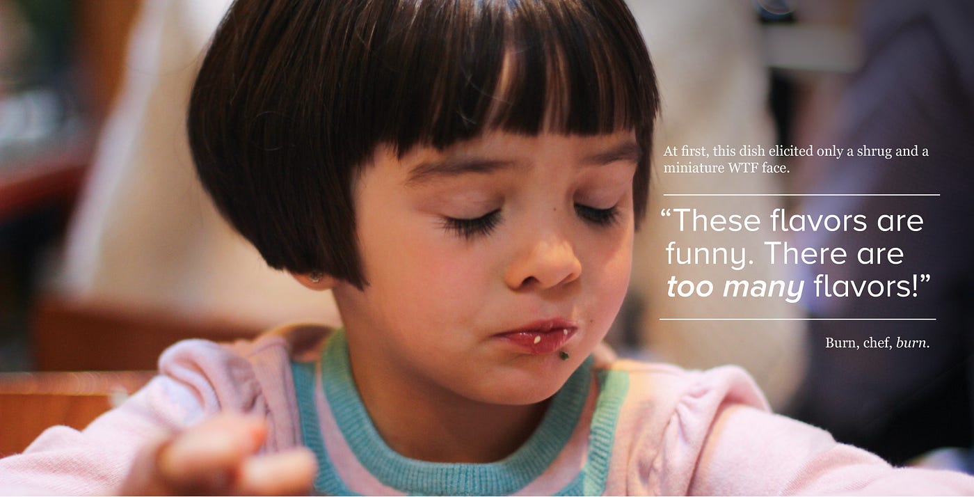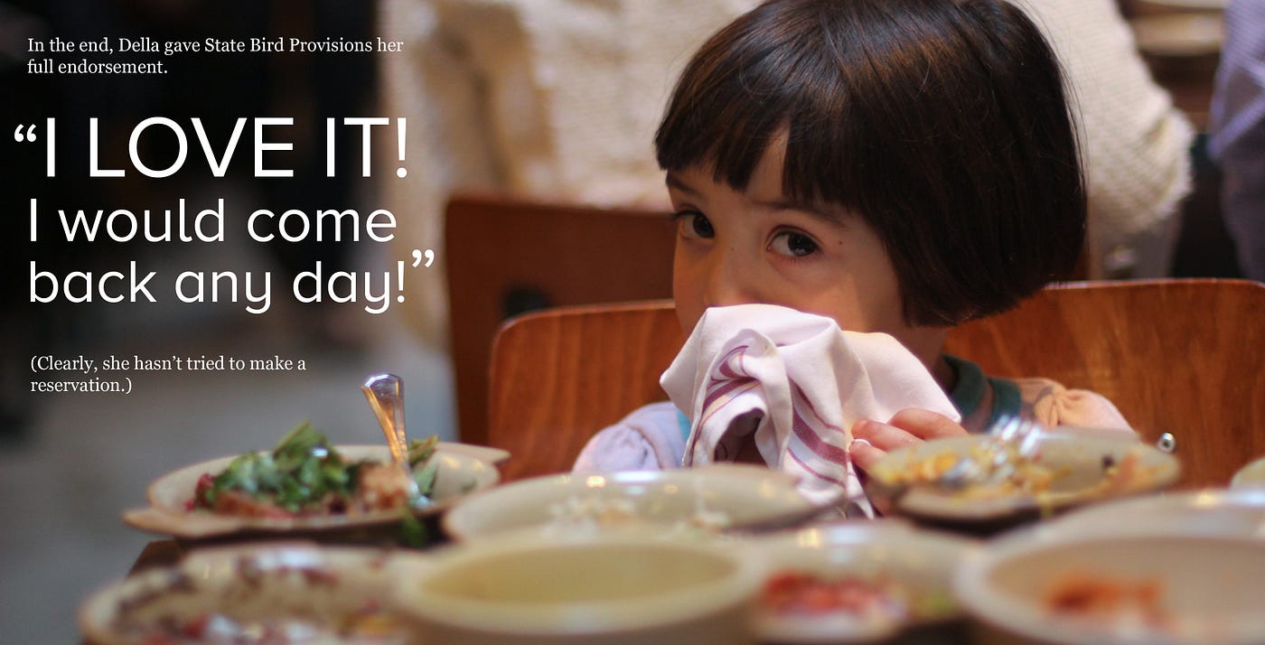 When James Beard declares your establishment the “Best New Restaurant in the Country,” it becomes a review magnet. A quick Google search and you can find pages and pages detailing everything from the construction of the walls to the dimensions of the bill. But you know who doesn’t care about décor and can’t spell “eclectic”? A four-year-old. For our second installment of “Kids Review Food” we took Della Garcia (favorite food: candy) to State Bird Provisions to bring you the purest critique of the country’s best new restaurant. I guarantee this is the only review where you’ll find the good backed up with pinky swears and the bad confirmed with crying.