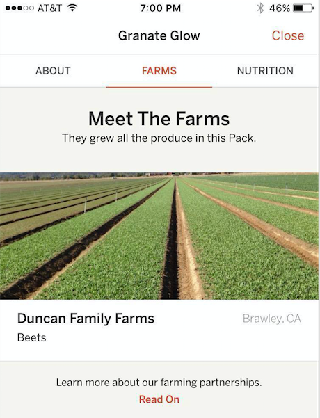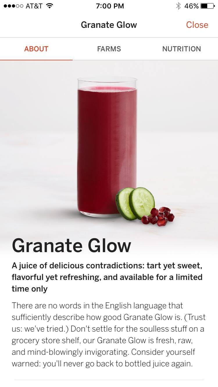 When I’m waiting for food to come out of the microwave, I’m usually lighting up or crying on the kitchen floor, remembering my life’s mistakes. But the Juicero doesn’t let me. While I’m waiting for my juice, the app on my phone pulls up the name of the drink I’m having and even tells me what farm the produce came from. I stand there and read about the farm my Granate Glow came from and all the good stuff that’s about to fill up my stomach. (I’m not completely clean — I had Popeyes for lunch, so that’s what the Granate Glow is now soaking into.)
