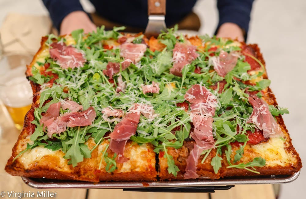 There are 11 pizzas in four forms and you can thankfully choose any topping: rectangular Sicilian, Detroit square, crispy Grandma-style and New York, which doesn’t resemble anything I grew up with in NYC/NJ, but is more like a thicker Neapolitan yet with different style dough.