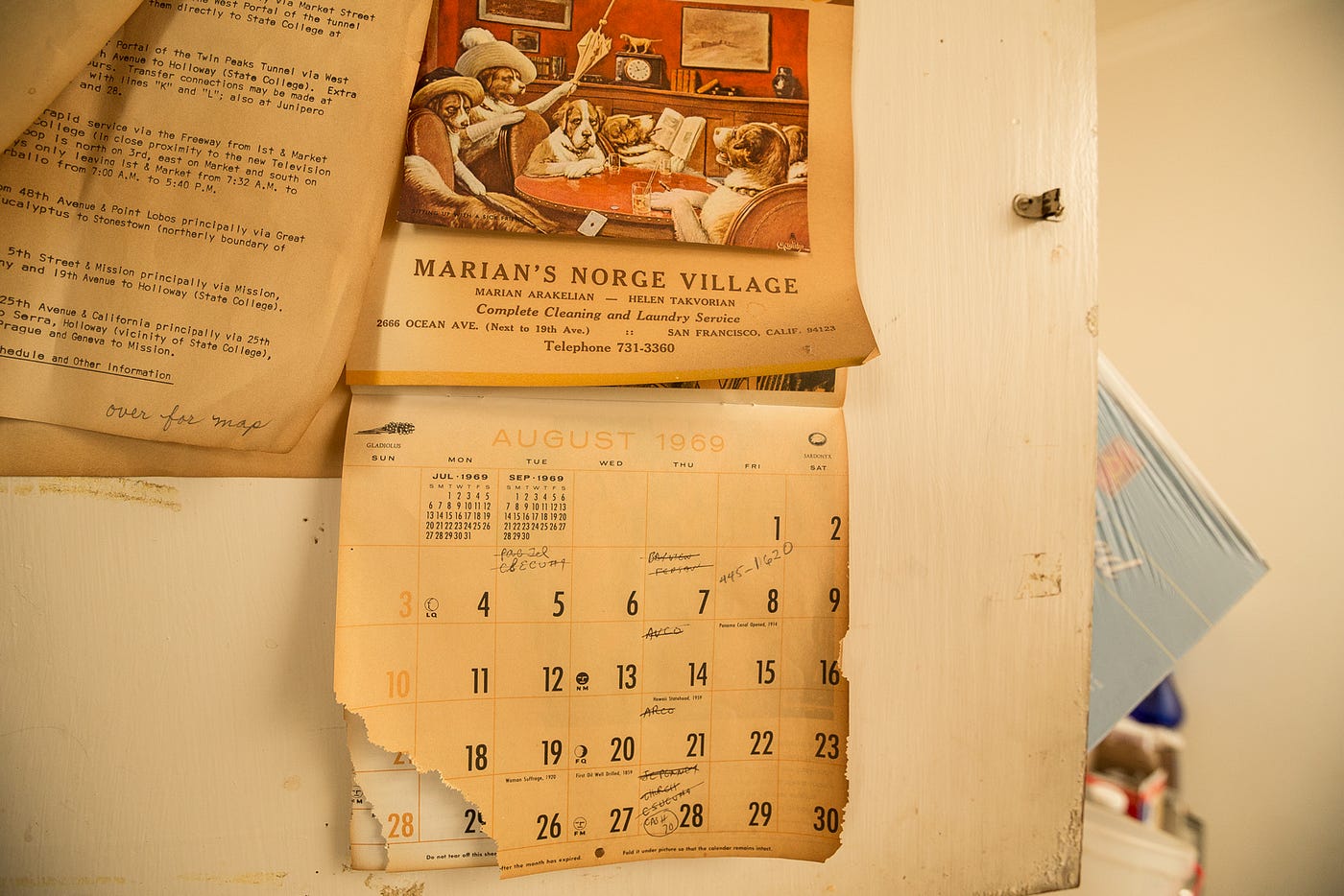 The two-story house was completely inundated with every type of useless personal belonging you can imagine. There were grass skirts, flashbulbs, a MUNI map from 1968, stacks upon stacks of National Geographic from the last 50 years, receipts from stores that don’t exist anymore, trash cans full of motor oil, boxes of maps from all over the world, just…everything — an entire life distilled into decaying piles of stuff. It took Jon and his crew three full days to finish emptying out the house. After a room was cleared, you could see lanes of dirty, worn-out carpet snaking through the room like a labyrinth with the walls removed.