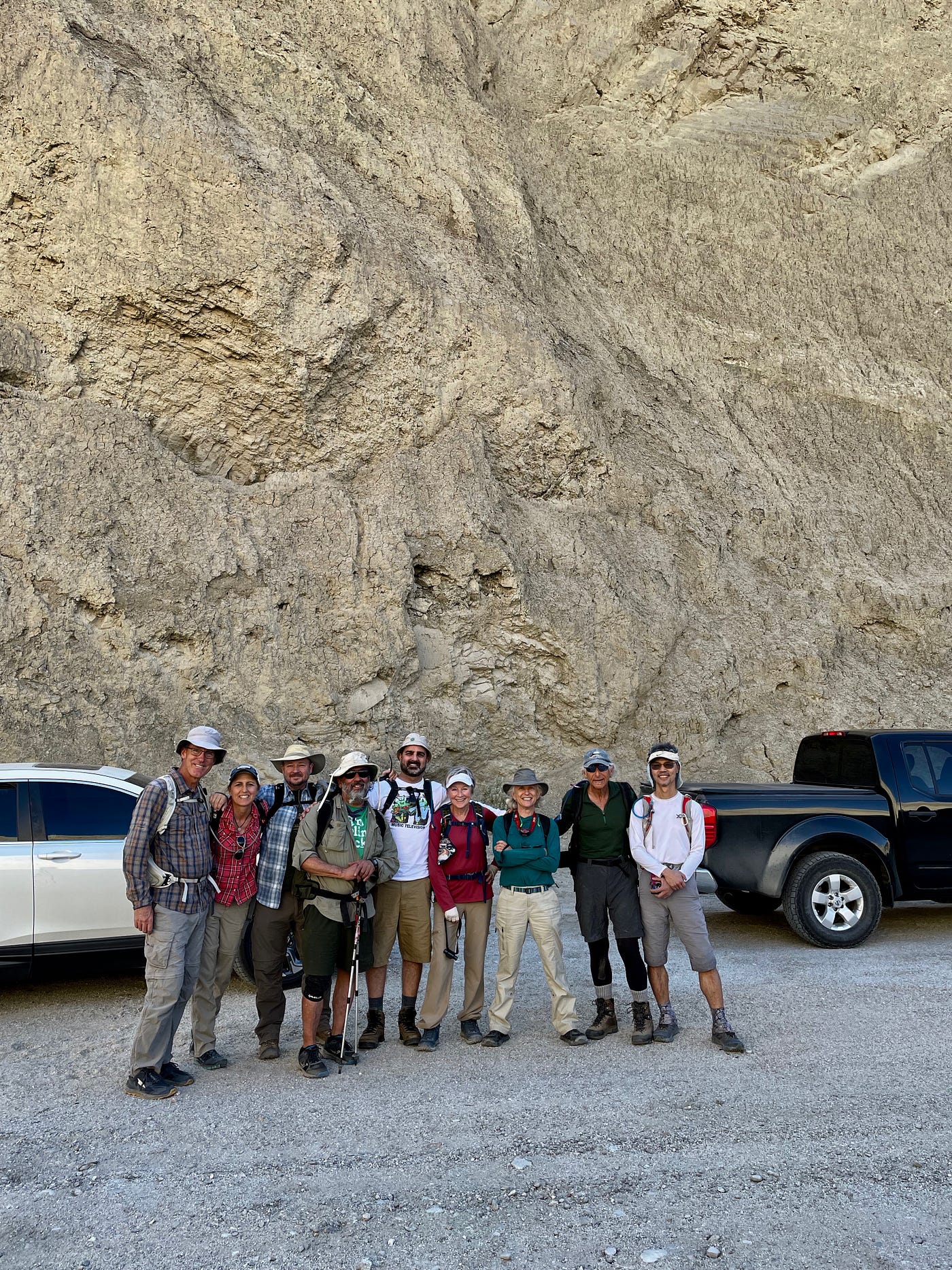 Early Friday morning, our group assembled and got acquainted as Carol and Paul prepared us for the day’s itinerary. I was impressed with their prior knowledge of the terrain and how much prep they had done, including safety precautions. We split into two groups of five piling into the high-clearance 4WD vehicles required to get to the trailhead. I went with Ari, Steve, Jessica, and Dan. For the first of many times, conversation turned to jumping cactus. To the uninitiated, which I was painfully not, it sounds like an urban myth. Those fuzzy golf-sized ovals, detached from their parent, will on the slightest provocation jump a foot to attack. The one that assaulted me years ago even made a U-turn to penetrate my calf, through long pants.