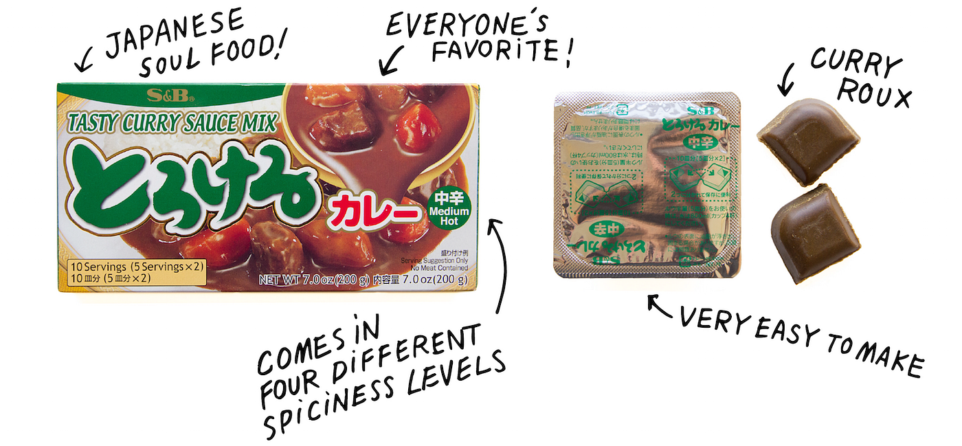 Surprisingly enough,curry is considered a Japanese soul food and is one of the most popular and widely consumed meals in Japan. It’s different in taste than, say, Indian or Thai curry because of its sweeter taste and thicker consistency.One of the most common ways of making Japanese curry at home is to start with cubes of curry roux, which are available at any Japanese supermarket. In Nijiya alone, there is a crazy amount of curry roux to pick from. They come in mild, medium hot, and extra hot, but Japanese food doesn’t tend to be too hot, so don’t fear the spicier ones.