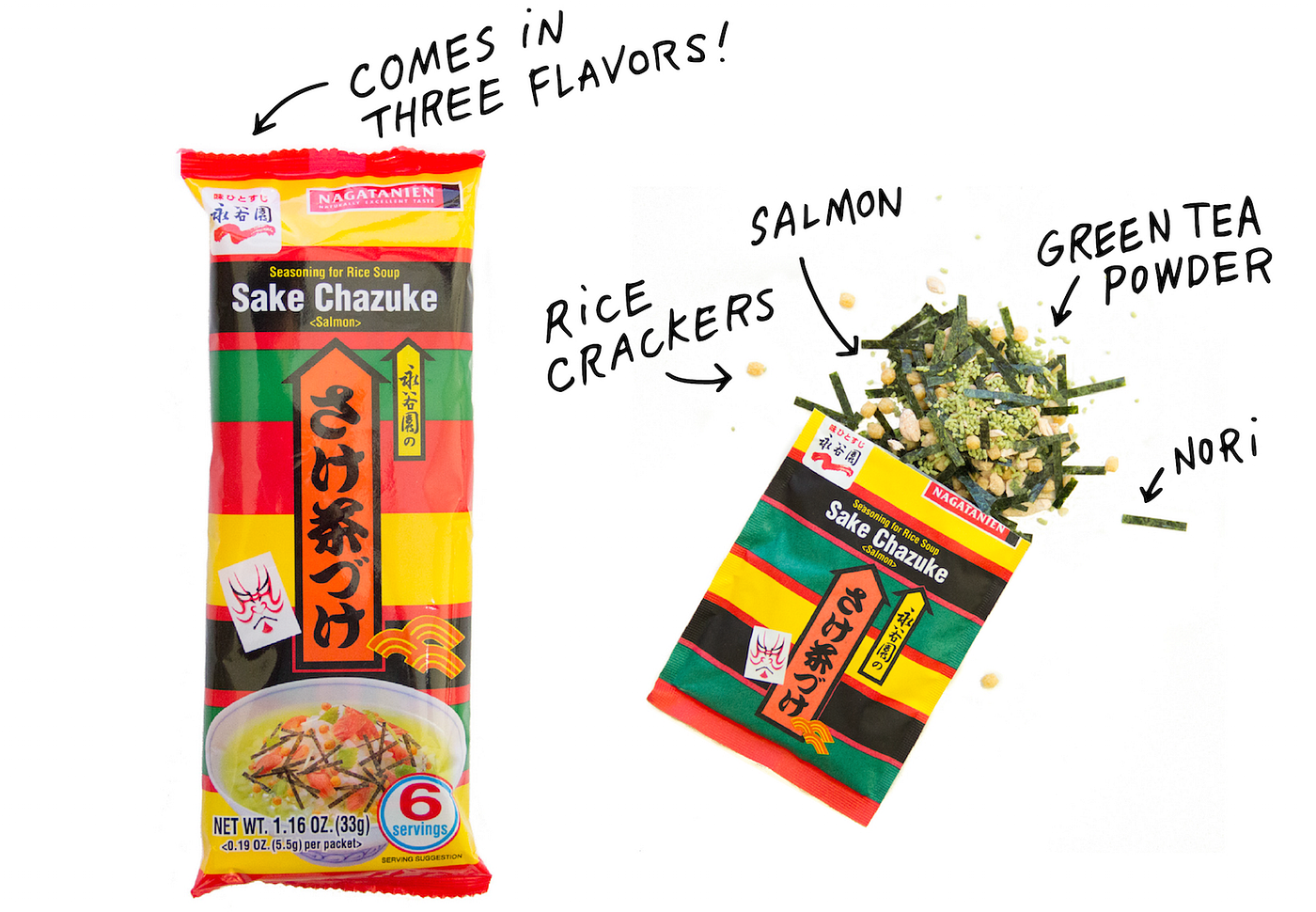 Instructions: Pour the seasoning out of the little bag into a bowl of cooked rice and pour hot water, instead of hot green tea, over the rice juuuuust until the rice is covered. If you want a more traditional version, you can include some more salty toppings, such as salmon flakes, umeboshi, pickled vegetables, thinly cut nori, toasted sesame seeds, and/or lightly smashed crunchy rice crackers.