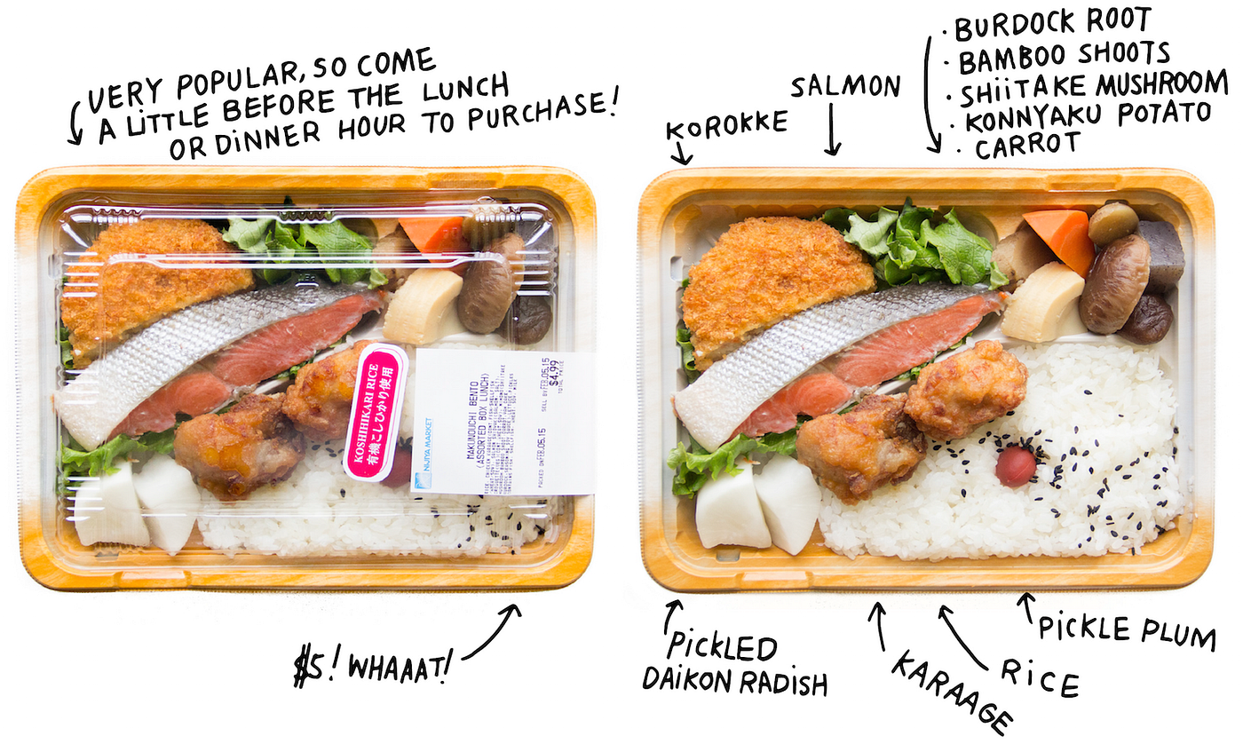 Bento is a really great representation of how Japanese people approach meals — a combination of smaller dishes enjoyed with rice. Instead of centering the meal on one main dish, the Japanese tend to eat several small portions. Japanese parents often spend a long time making meticulous and cute bento for their children, spouses, and themselves to take to school or work. You can get bento in almost every Japanese grocery and convenience store. There are endless varieties of bento, but the typical bento has rice with umeboshi (pickled plum) on top, cooked fish or meat, karaage (fried chicken), tempura, korokke (Japanese croquettes), tsukemono (pickled vegetables), and some kind of salad.