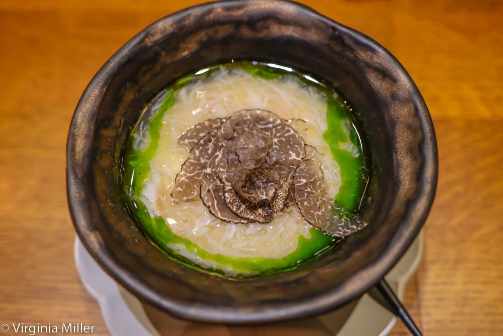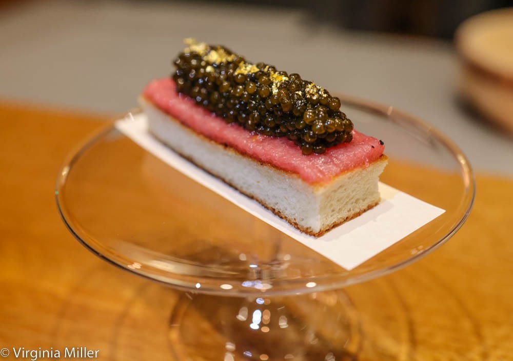 Maybe the most fun of a shining lineup of kaiseki-worthy bites is the shokupan (Japanese milk bread) course. Different than your typical milk bread, this is a rectangle of grilled milk toast layered in toro (fatty tuna), topped with golden kaluga caviar. It’s one decadent few bites, dissolving in the mouth.