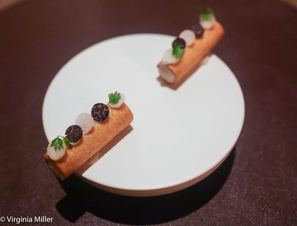 Some of the very best bites, however, are amuse bouche starting bites on the full tasting menu, like a little brioche sandwich layered with white sturgeon “bacon”, avocado, caviar and crème fraîche. Or a divine celery root tube laced with dill and black truffles that reminds me of Chicken in a Biskit crackers, a childhood favorite. It’s a “wow” moment.