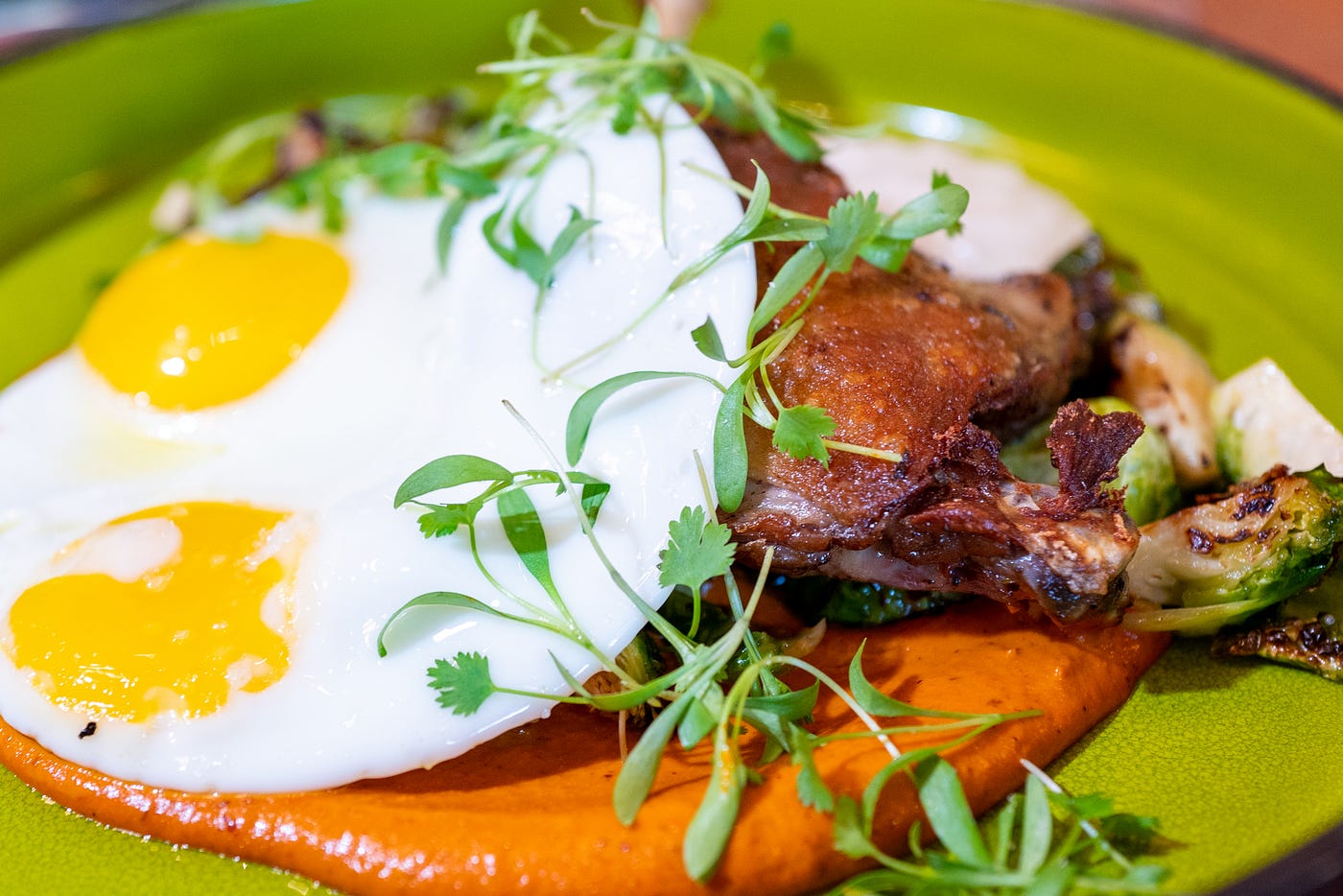 Eggs from Hunt’s farm feature prominently on Alley & Vine’s menu, and much of its brunch menu is centered around dishes with names like “Poached Eggs” and “Sunny Side Up Eggs.” To call these egg dishes, though, is a bit of a misnomer. The Poached Eggs, for example, does indeed include poached eggs. But it’s also full of tasty strips of Flannery beef and frise lettuce. Likewise, the Sunny Side Up Eggs has a couple of the eponymous fried eggs in it, but the anchor of the dish is a crunchy quarter duck prepared as a confit, cured in its own fat. I love duck confit, so this was a winner for me.