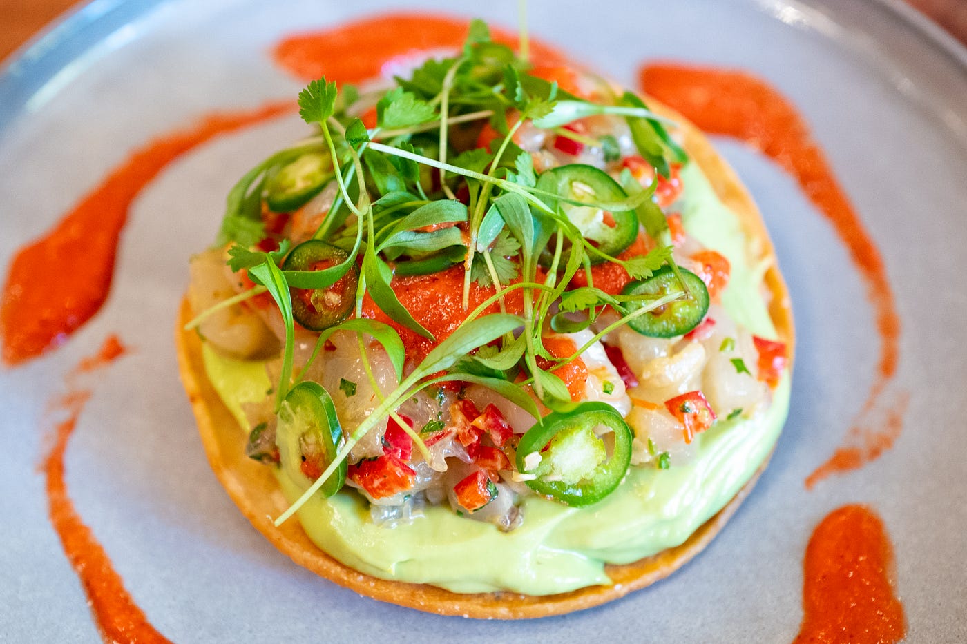 During my visit, I started with Alley & Vine’s black pepper gruyere toast, which is a bit like a fancy piece of bruschetta, brimming with prosciutto and goat cheese and topped with cape gooseberries. I also tried the sea scallop tostada, which was my favorite of the restaurant's appetizers. It’s a bed of ceviche-like sea scallops on top of a rich avocado cream, resting on a fried tortilla and topped with not-too-spicy Fresno chilis. Bazo’s Peruvian background was clearly present in the dish, and I enjoyed the contrasting textures of the ceviche and the crunchy, fried tortilla.