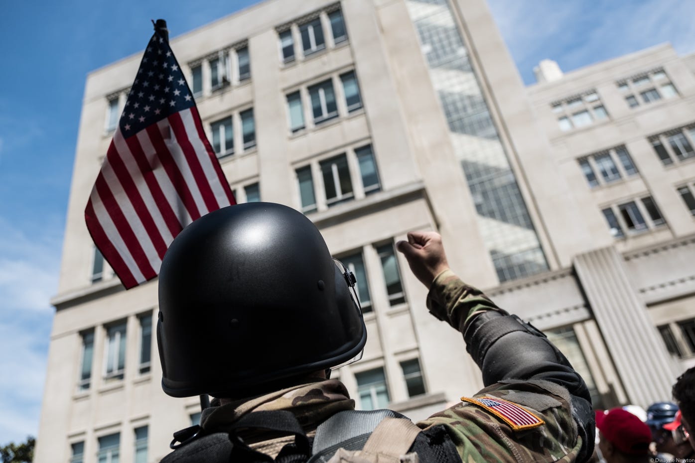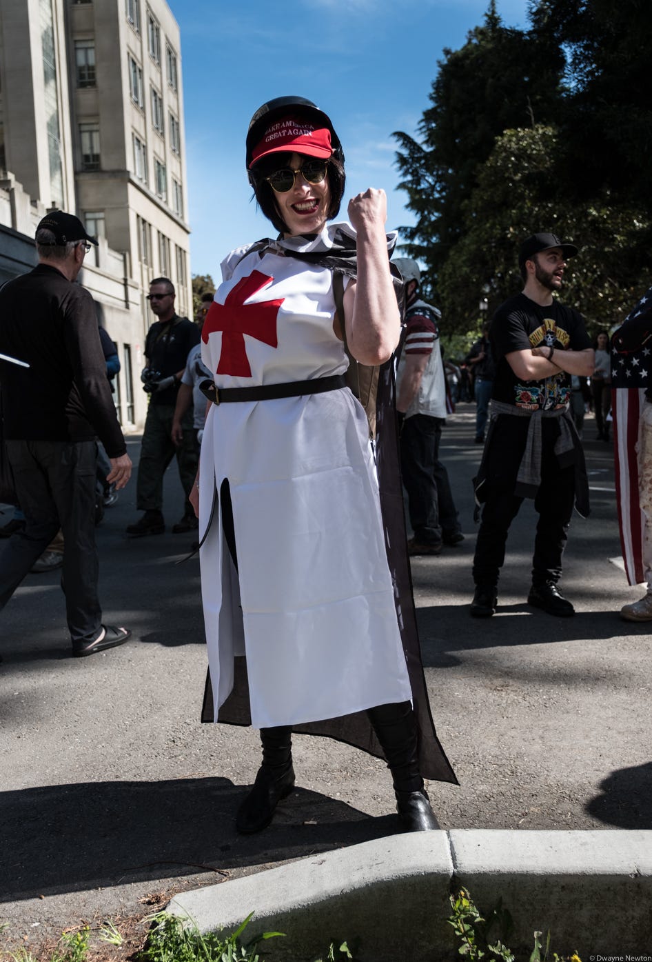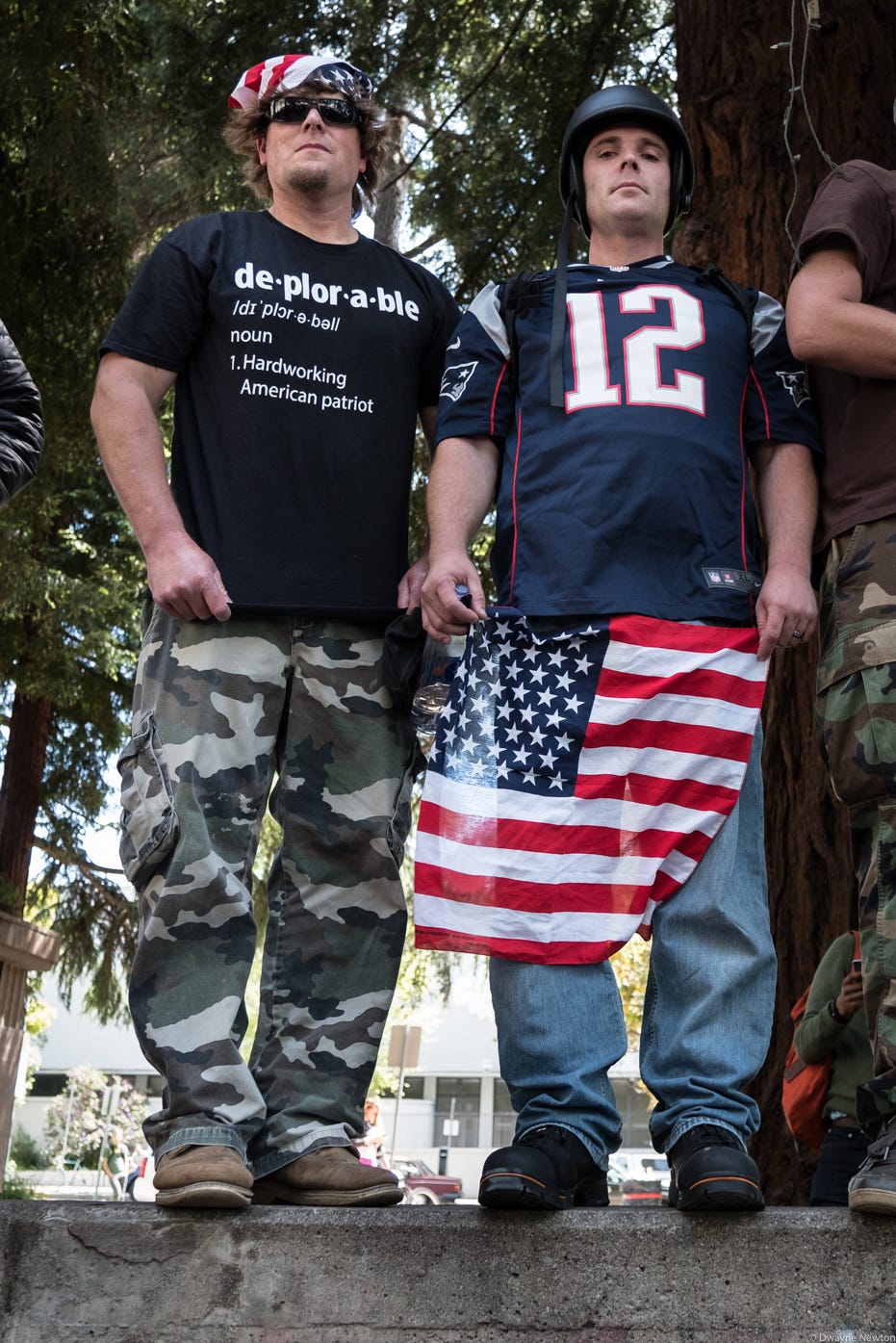 The alt-right called it a “Rally for Free Speech” at the Berkeley Civic Center, where these pictures were taken. They came from all over the US, festooned with flags, pins and bumper-sticker patriotic quotes velcroed to leather vests. Also, they came prepared — with an armory of helmets, shoulder and knee pads, fighting gloves, baseball bats, knives, radios, gas masks, goggles and scores of big dudes with big arms.