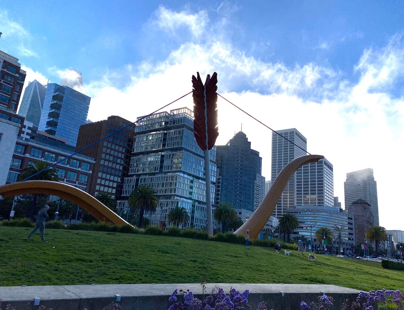 Cupid’s Span, which commands a territory on the Embarcadero at the foot of Rincon Hill, was a gift to the city from Gap founders, art collectors, and Oldenberg admirers Don and Doris Fisher. They commissioned the 70-foot sculpture in 2002 when historic Rincon Hill was beginning one of those often-in-San-Francisco rebirths. As anyone old enough to remember those times will attest, some people loved it, some hated it, but almost nobody had no opinion. On a Commonwealth Club city walk a few years after Cupid’s Span settled in this writer heard a tourist comment, “I know exactly how he feels.” Which was an enigmatic statement too good to explore.