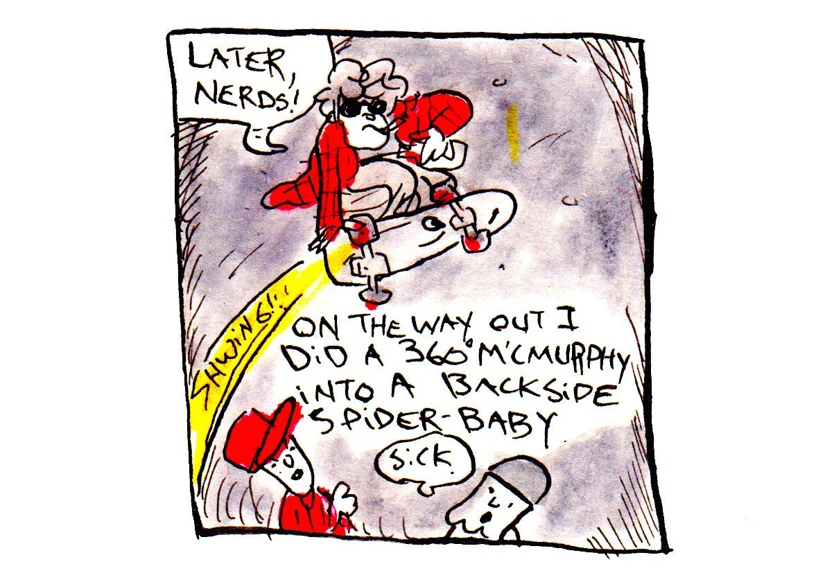 I sat on my skateboard way in the back and drank all the free beer I could. Slowly, it became obvious that Mr. Crowes was fucking wasted. He went on at great length about how superhero comics are bullshit.