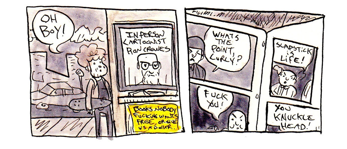 I couldn’t fucking believe it. My favorite cartoonist, Ron Crowes, was going to be in town to promote his new book, Crippling Void, which follows the lives and times of the Three Stooges. It was supposed to be his most existential and depressing book yet!