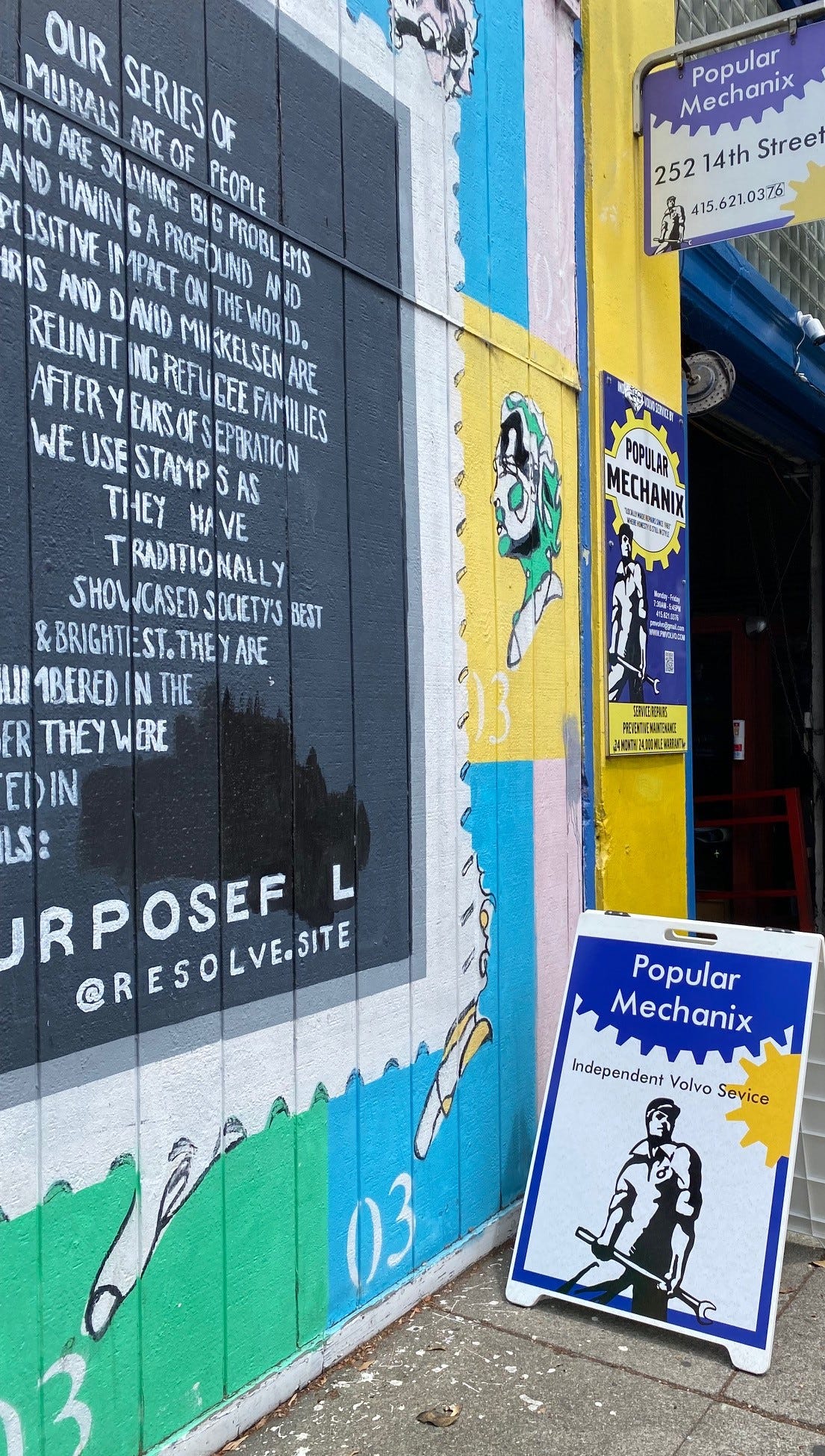 So I noticed the plywood fronting a vacant lot in between the residence and the repair shop I inelegantly term a garage. The painted plywood features more murals, of abstract faces on postage stamps. But not just anonymous faces, these are faces of “people who are solving big problems and having a profound and positive impact on the world.” These murals are sponsored by Resolve, a nonprofit which “envision(s) a less polarized world with a shared commitment to transforming ambitious ideas into real benefits for people, communities, and ecosystems.” And again, why not?