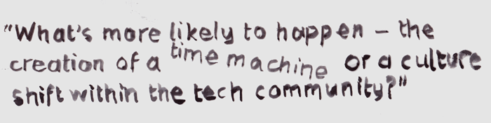 And how might a culture shift happen? Luckily, there already exists a subset within the tech community who have succeeded at both working in that economy and caring about things besides making money. I count some of them as my friends. They participate in the Wigg Party and the UEL and were an important part of the success of [freespace], providing both financial and human support. It’s unfair to them that they must suffer abuse for the failure of the larger tech community.