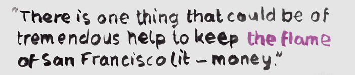 Even if you don’t have the time to support the cultural lifeblood of this city, there is one thing that some of you very famously do have, something that could be of tremendous help to those of us who are struggling to keep the flame of San Francisco lit — money. For those of us in the creative community who have for years been eking out an existence, it is very much “water, water, everywhere, nor any drop to drink.”