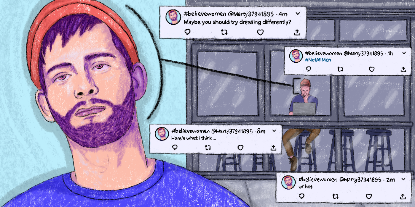 He sometimes wears a #BelieveWomen T-shirt and has used it as a thought-starter for why men deserve to be heard too.