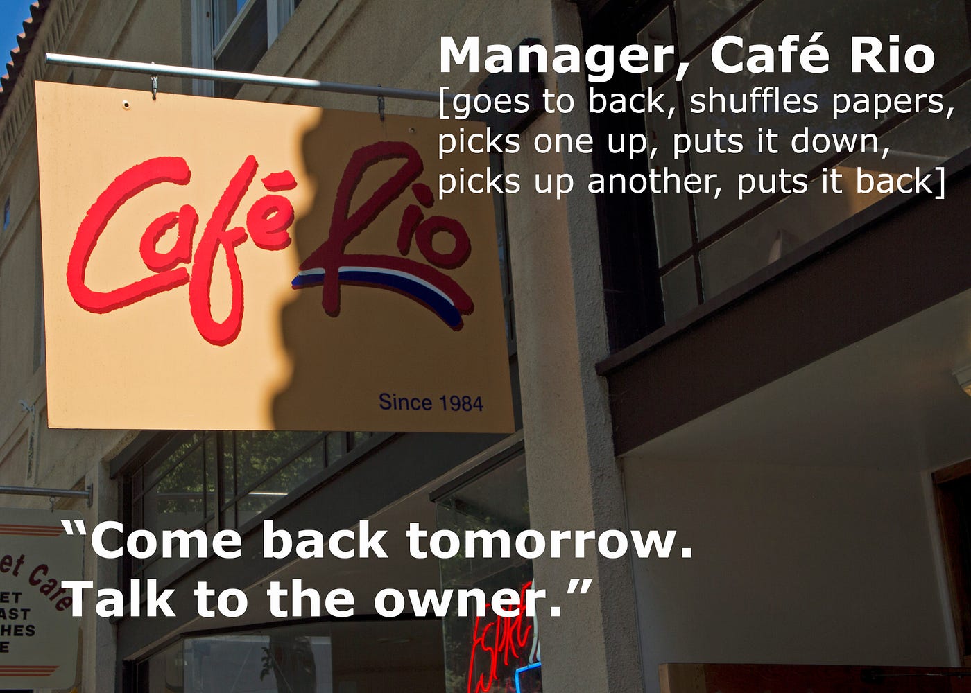 S: “The manager isn’t here right now, and I don’t know where that is,” the hostess said.