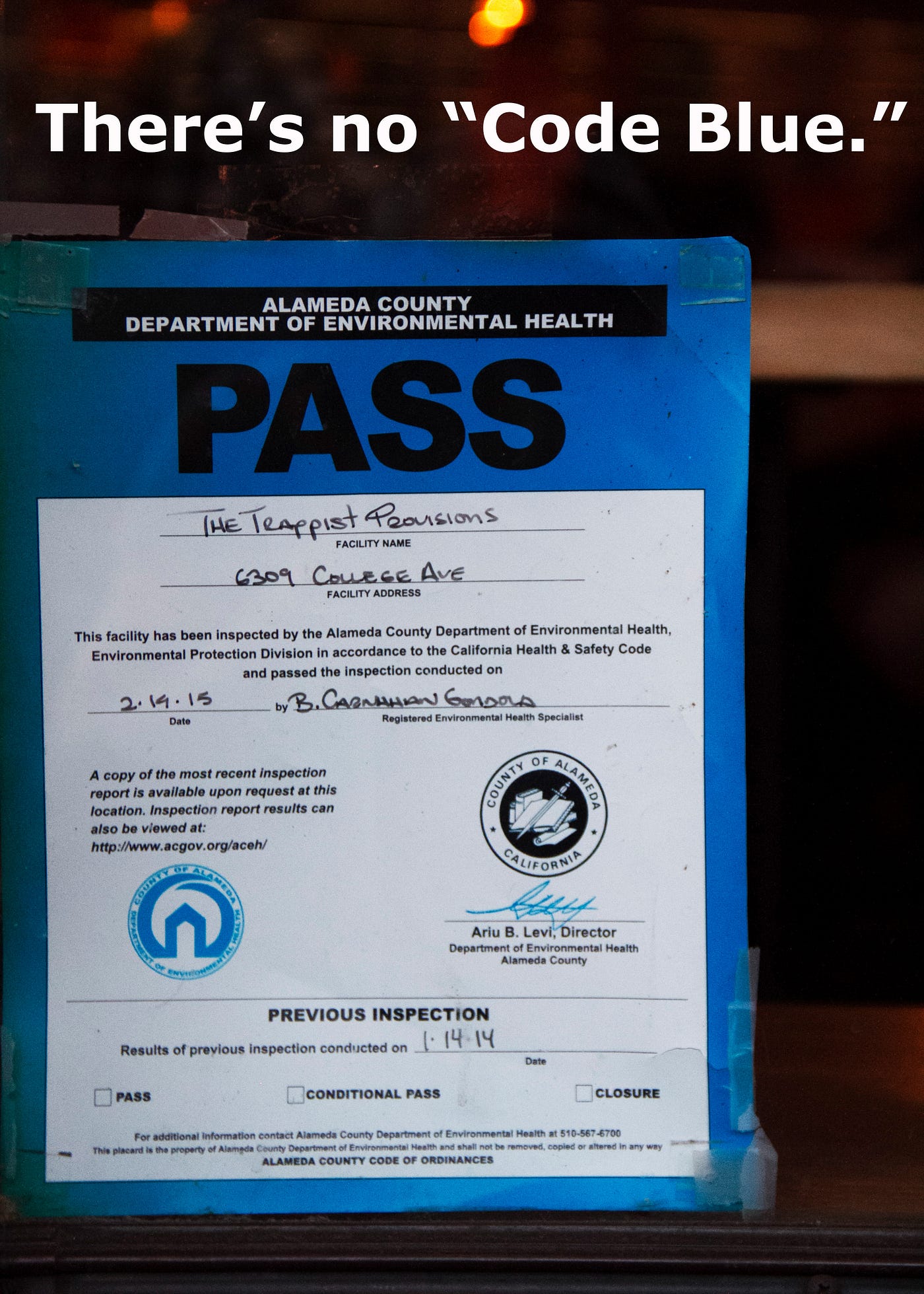 So our record in Berkeley was two for three, which wasn’t bad but hardly statistically conclusive. However, Berkeley is unusual, being one of only four cities in California that does not rely on the local county for health inspections. But given that the report-posting rule is a state law, we went to Southie and Wood Tavern on College Avenue in Oakland and asked to see copies of their most recent health reports. The results were less than stellar.