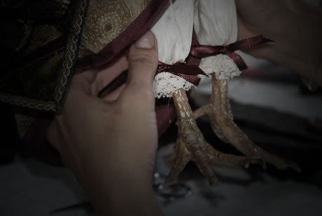 Her smartly dressed creations are about a foot tall, detailed and delicate with animal skulls for heads, claws or taxidermied hands, and elaborate period costumes and accessories. All of her female creatures sport little fancy bloomers beneath their skirts. In her living room, display cases show off some of her work along with a selection of skulls. She points out a missing foot on one, and the re-enforced latch to keep her cat from sampling further.