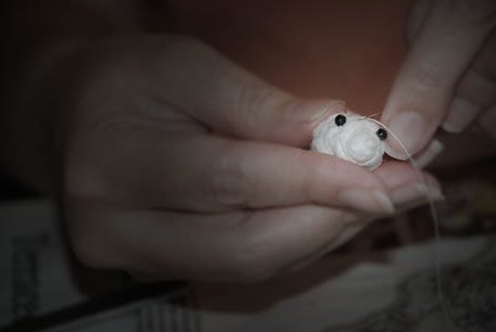 A wire armature is inserted to give strength and short-term flexibility to the legs and tail, followed by a tiny mouse-shaped form made of cotton balls and wire and two black beads stitched on for eyes.