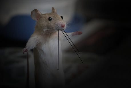 Once the forms are inserted, they instantly look mouse-like again. The skin is closed with invisible stitches, and with a few deft twists of the tail and feet they stand up on their own. She smooths the ears, moves his paws into place, and pins his mouth into a more natural pose with three large pins. It’s surprisingly quick and bloodless, all things considered.