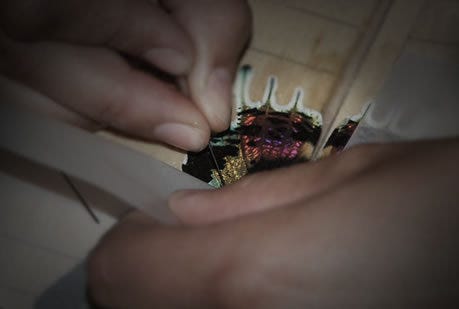 Kylea Borges, our instructor, starts up by introducing us to the shiny green Chrysochroa opulenta beetles and quickly runs through the steps of soaking and carefully arranging them with about a thousand tiny pins. I’m worried — it looks a little more complicated than expected. As she passes them out I am crossing my fingers that mine comes with sturdy parts. She warns us that they may be a little stinky.