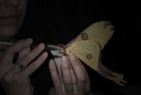 The final part of mounting the moth is manipulating the wings, which have been closed up in a less showy position, into a more dramatic spread. This is done without directly touching the wings, yet holding them in place, using just the tip of one tiny pin to slide them into place — while being careful to not tear holes, which I do almost immediately. You need three hands and a prehensile tail to get the appropriate angle and hold to do this. The classroom fills with muttered curses as we attempt to not destroy the beautiful wings. The instructor makes reassuring little statements, like, “It’s nearly inevitable. Don’t worry too much about it”.