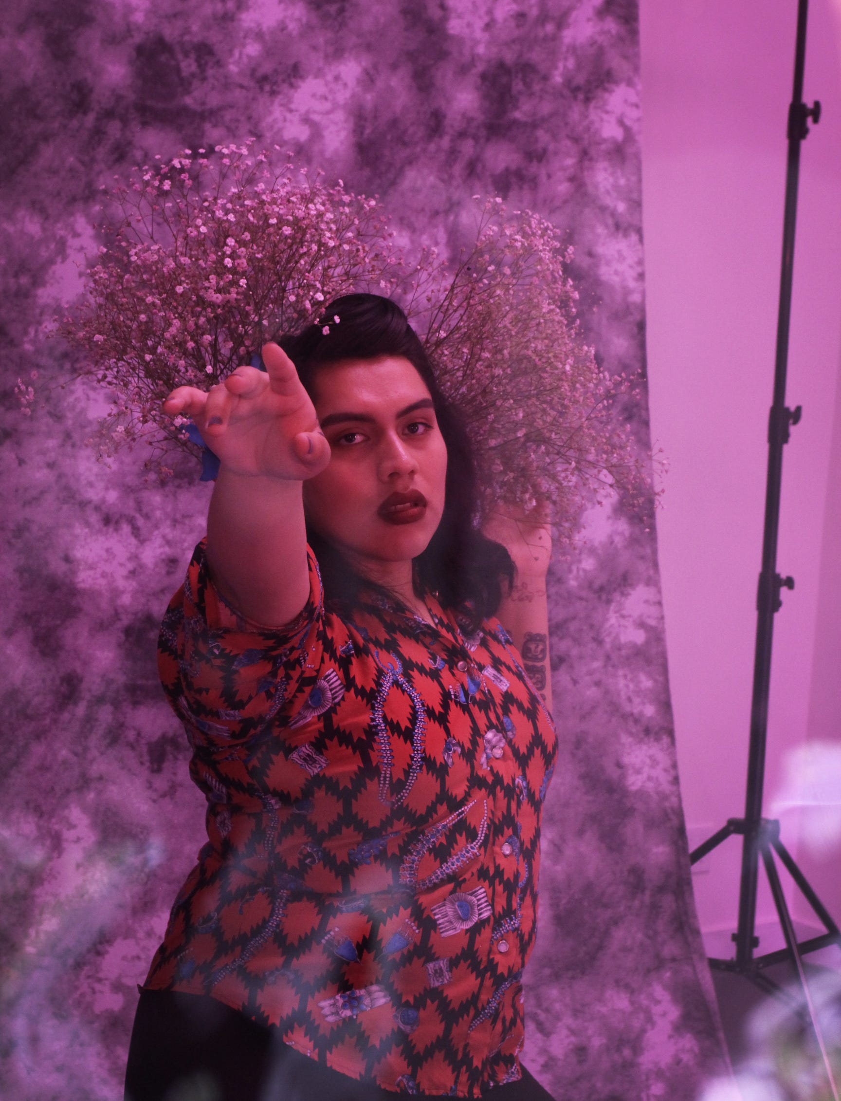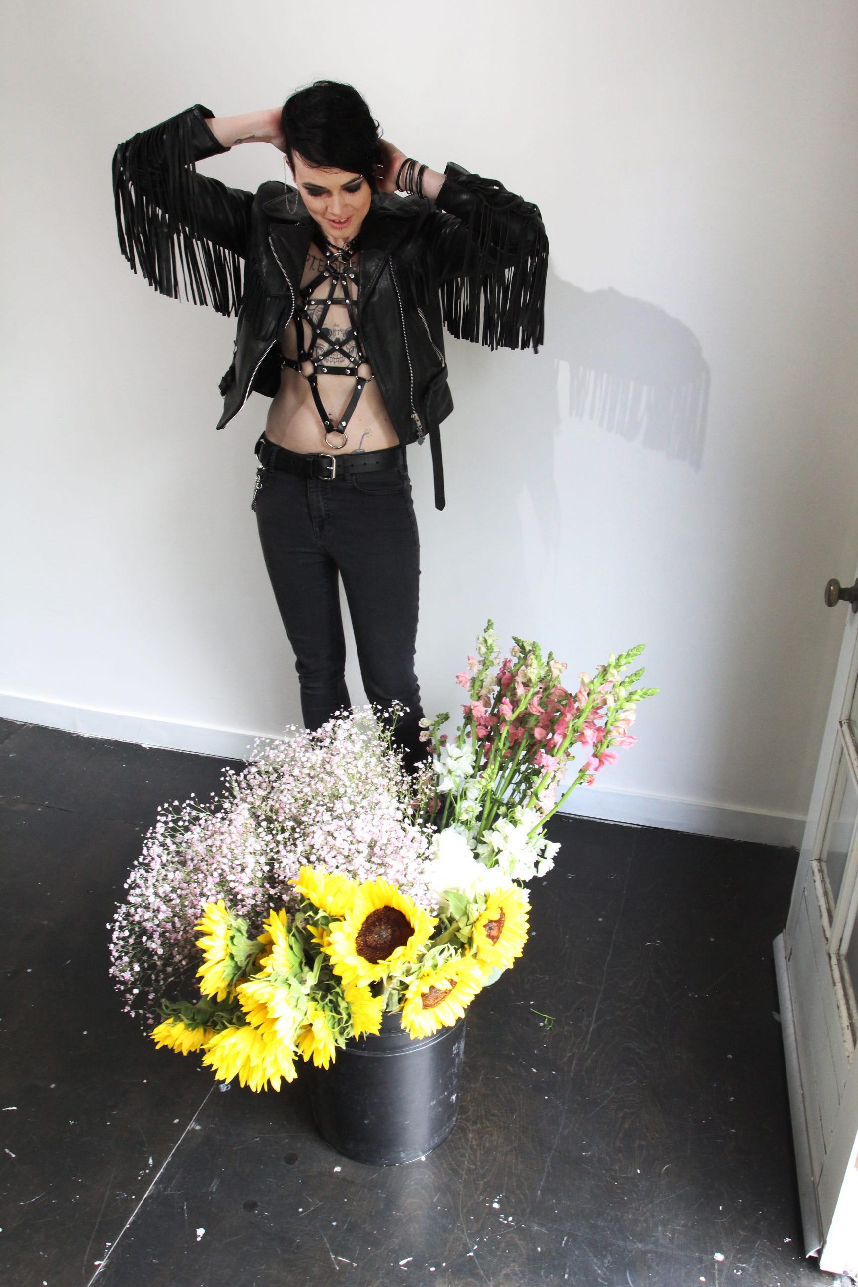 The gorgeous flowers were donated by local florist Bell and Trunk Flowers. Hunter-Savoy Jaffe, whom I first met at the candlelight vigil for the Oakland Ghost Ship fire, works for Bell and Trunk and connected me to the owner, Vanessa. Hunter-Savoy has been so supportive of this project from the beginning and was one of the past participants. I often use flowers in my work, and some of my most favorite images of Cash feature her holding roses. The addition of these nice flowers really adds to the photo shoot and makes the subjects feel more comfortable when they have something to hold.